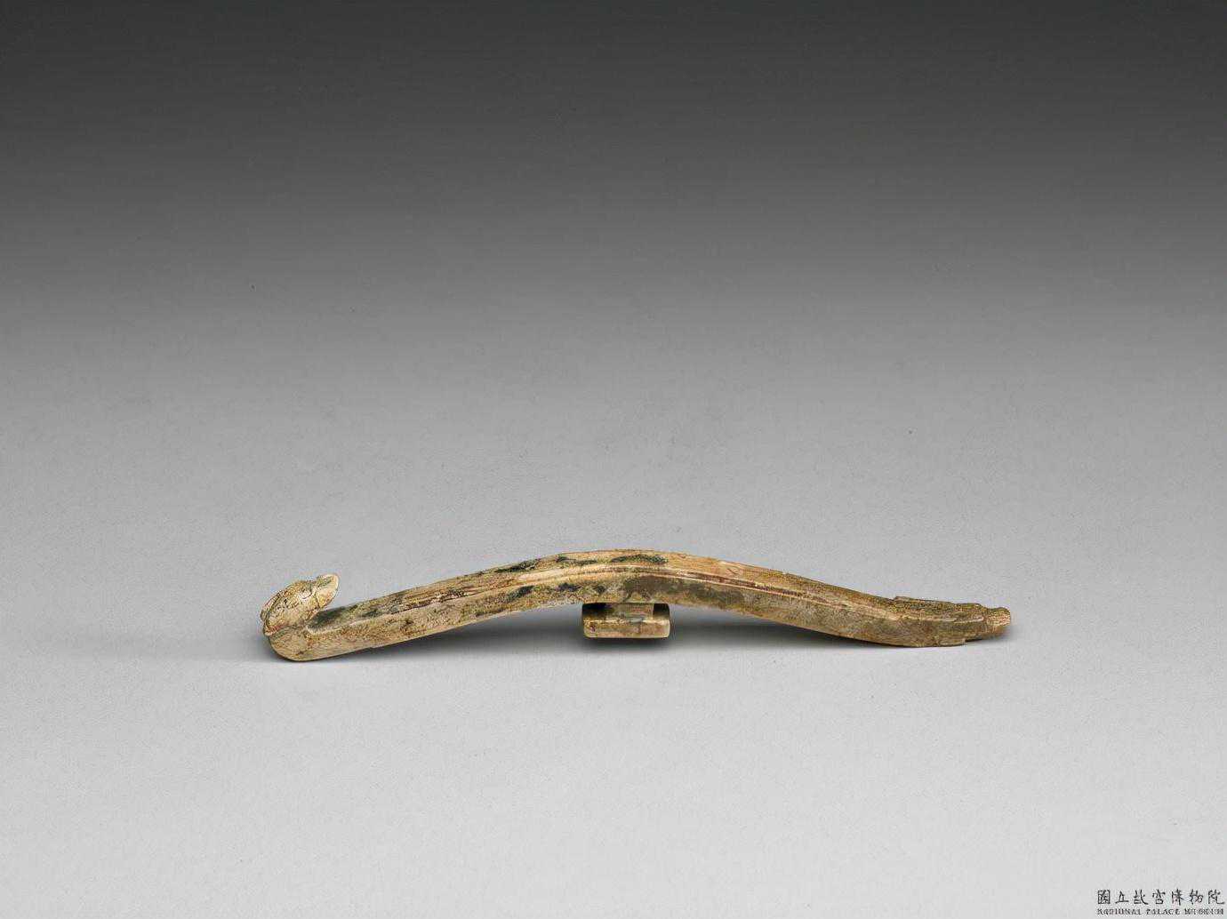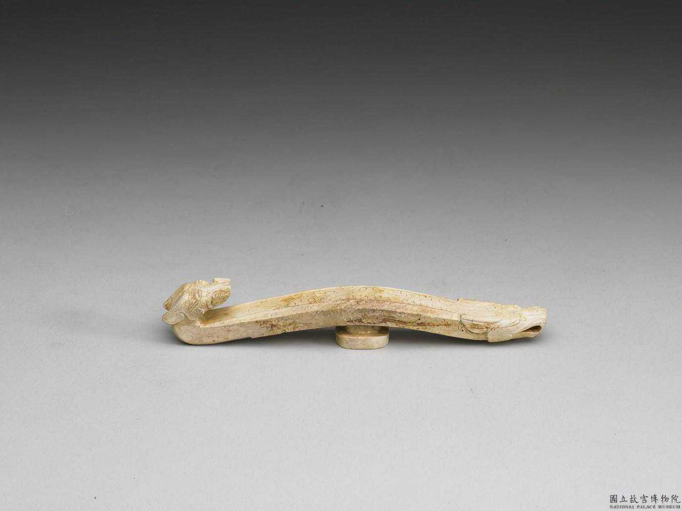 戰國龍首玉帶鉤。青黃玉,多沁作白色,有玻璃光。細而長,鉤首與鉤尾均琢龍頭,工精紋美。長20.7公分。國立故宮博物院。