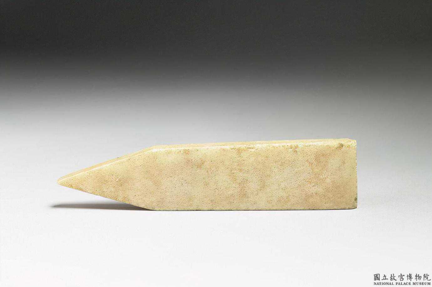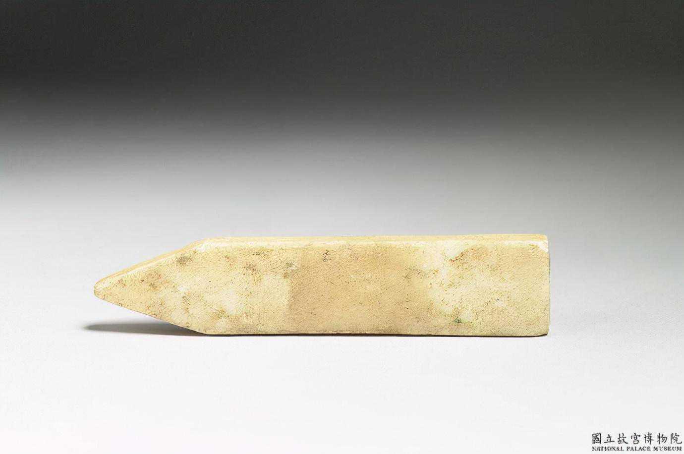 東周石圭。青白色玉石,泛淡黃赭斑。長條狀,一端作方形,一端作尖角。樸素無紋。9.2公分公分公分。國立故宮博物院。