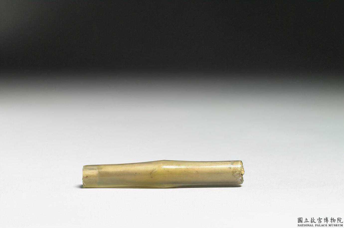 東周瑪瑙飾件。黃色瑪瑙質圓管。中間較粗,兩端較細,中間貫通。國立故宮博物院。