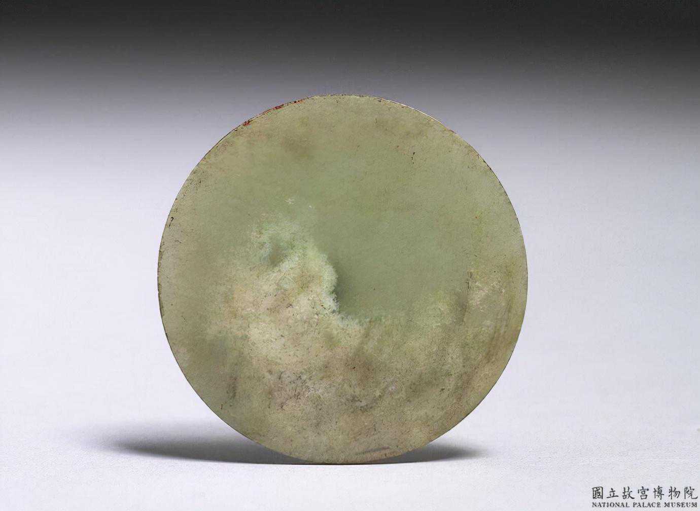 東周玉飾片。青玉,局部為白色。圓形玉片。全器無穿孔。3.1公分公分公分。國立故宮博物院。