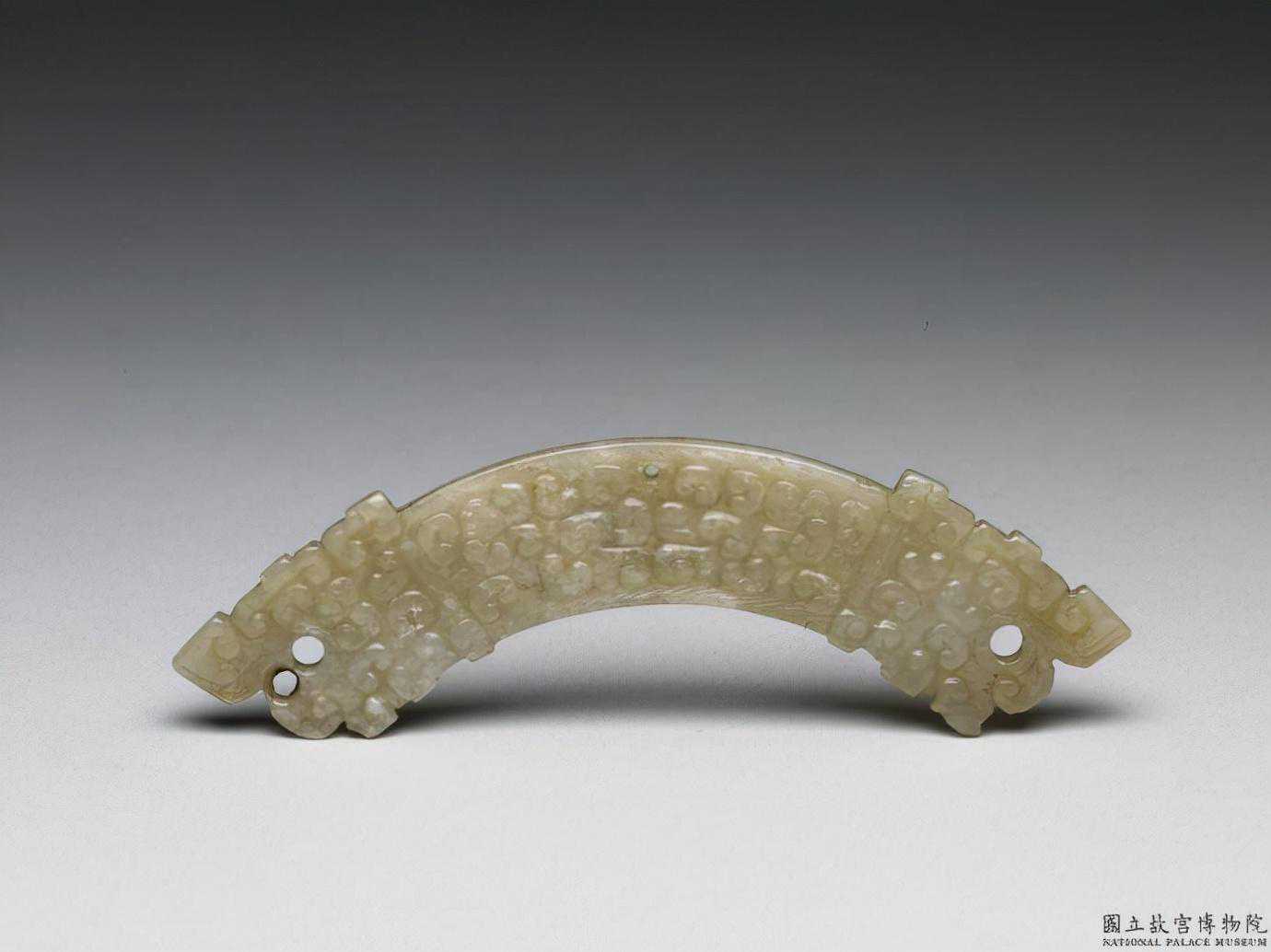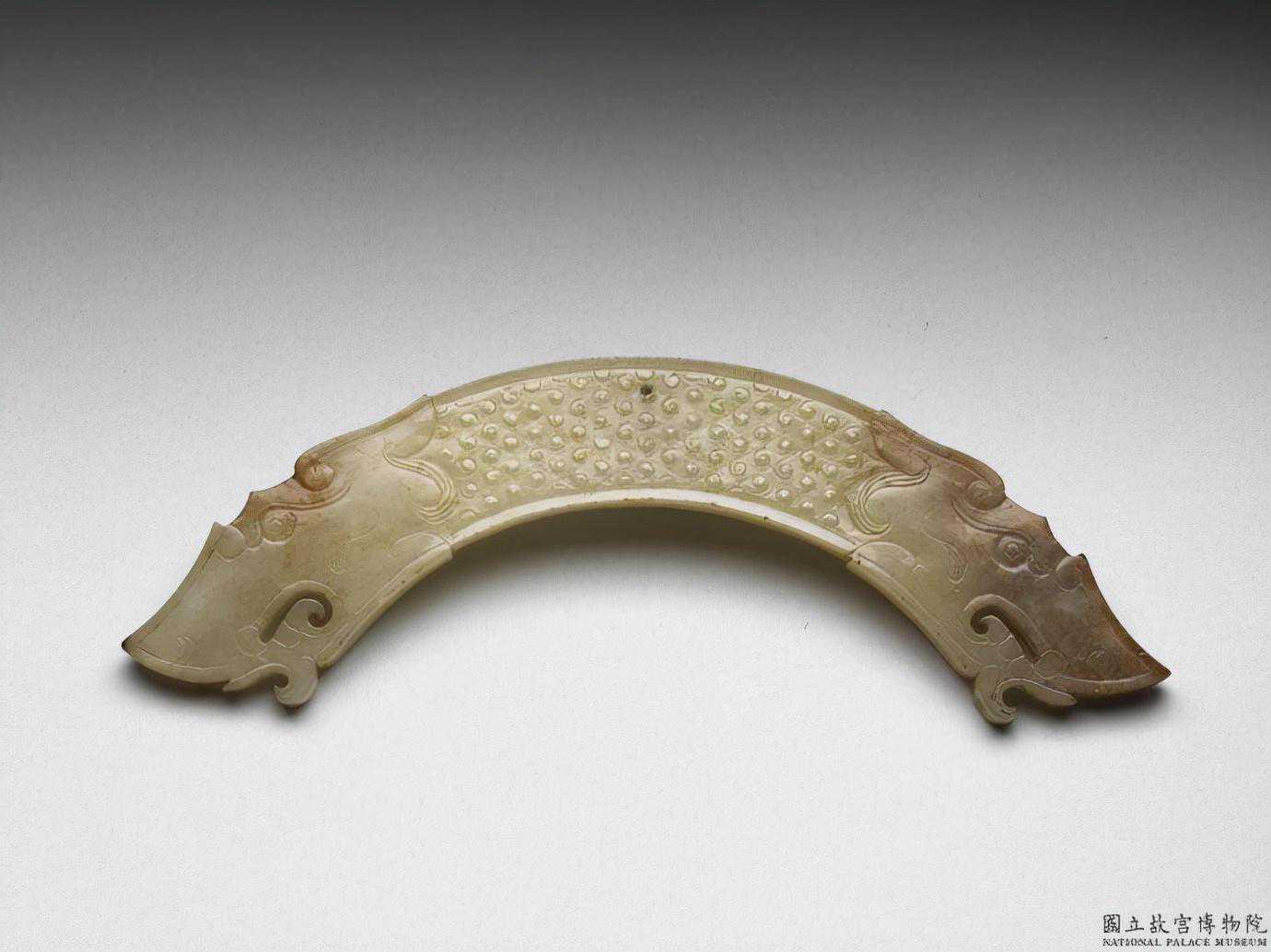 戰國白玉龍紋璜。白玉,有灰色、黑色、赭色斑。璜形,弧度半圓。兩端作龍首,嘴部圓孔和捲鼻飾以繩紋,兩面皆琢滿榖紋。上緣中間鑽有一小孔,以穿繩佩掛用。長12.6公分厚0.2公分。國立故宮博物院。