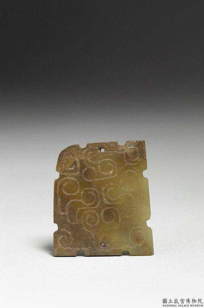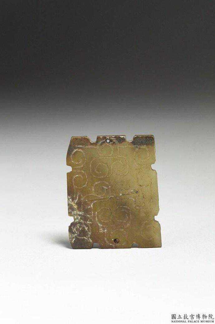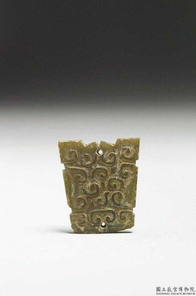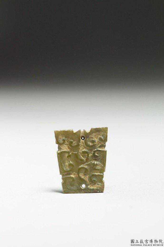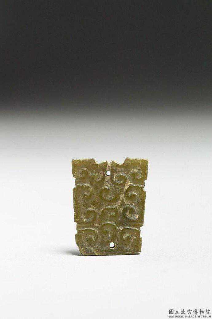 東周玉飾片。青色玉。長方形玉片,四周有凹凸齒棱,單面淺浮雕雲紋,間有斜線紋,組合而成龍紋。四角各鑽一孔。2.7公分公分公分。國立故宮博物院。