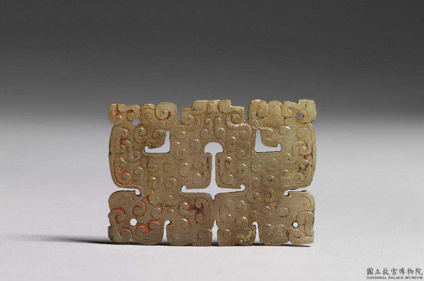 東周鏤空龍鳳玉佩。青玉,表面沾有硃砂。方形,鏤雕一對龍鳳合體,沿輪廓有一圈弦紋,其內浮雕雲紋,間有斜線紋。四個角各鑽有一孔。3.6公分公分公分。國立故宮博物院。