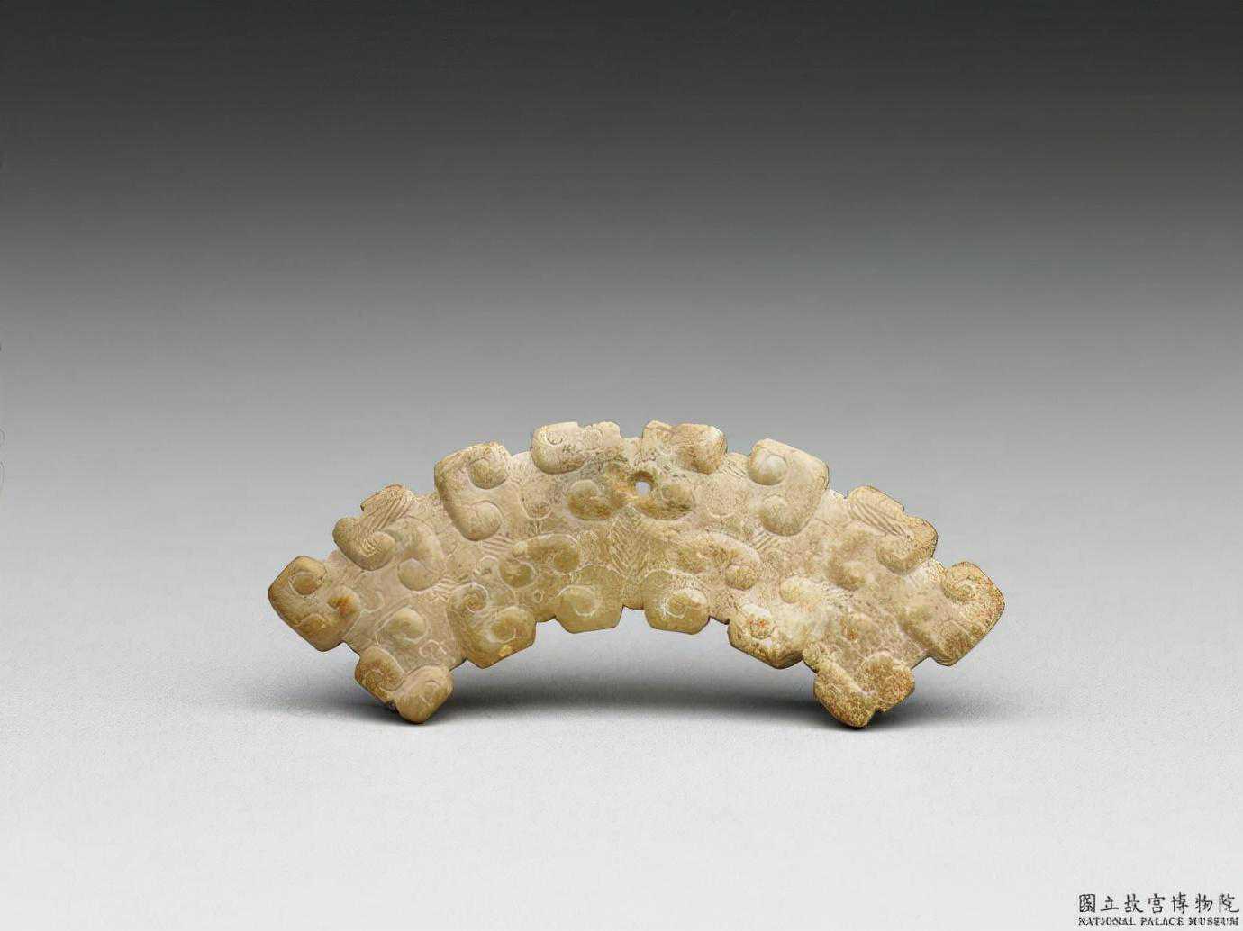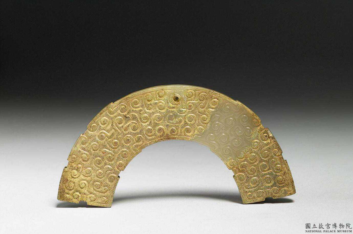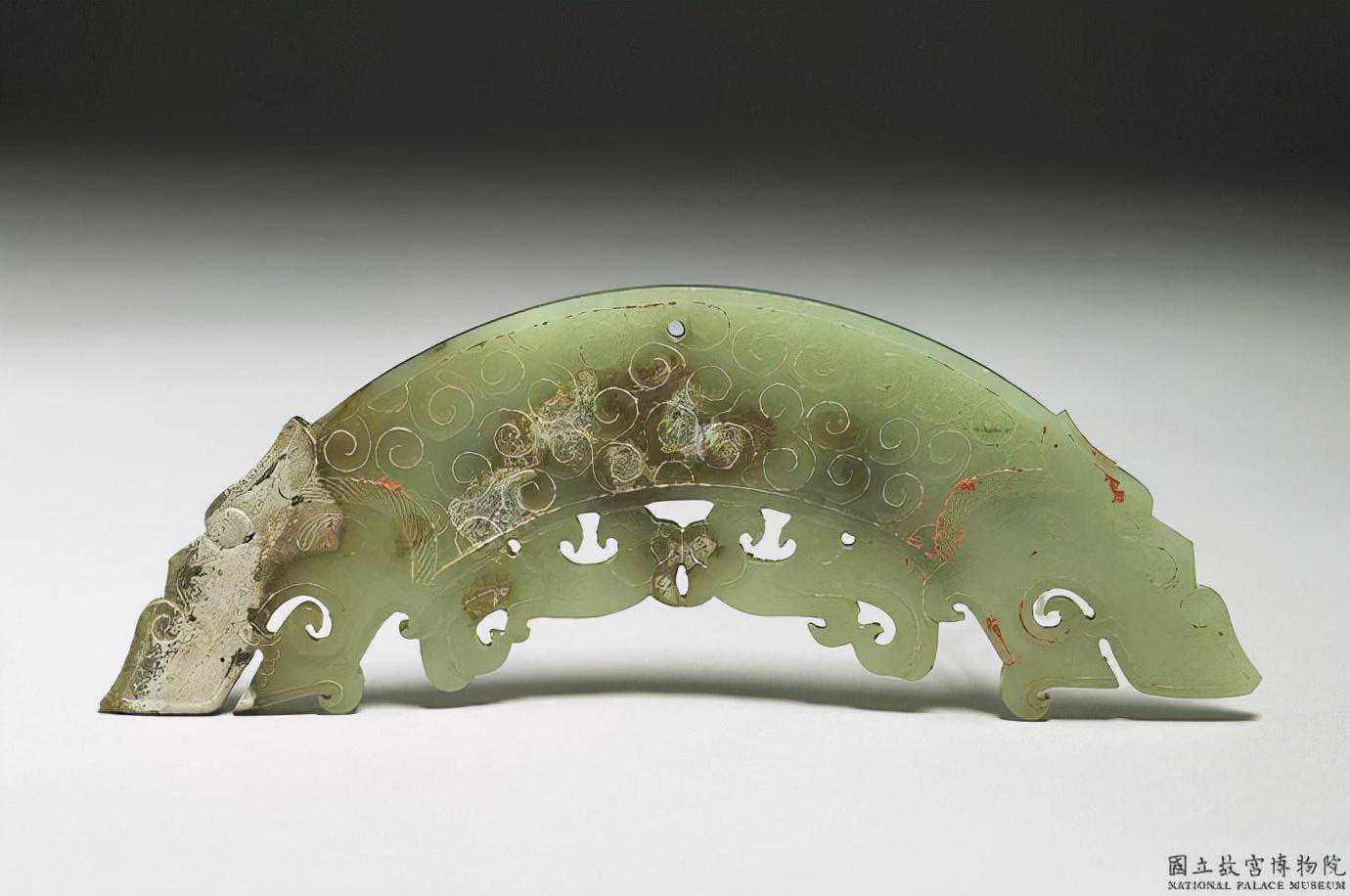 東周玉璜。青白玉,大部分有深褐沁斑。體扁平,作半圓弧形,兩面雕琢以雲紋構成的變體龍紋。璜體上端鑽一圓孔,可供穿繫,玉璜屬於裝飾品類。國立故宮博物院。