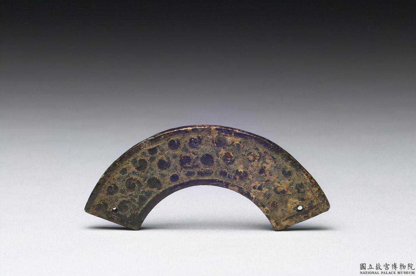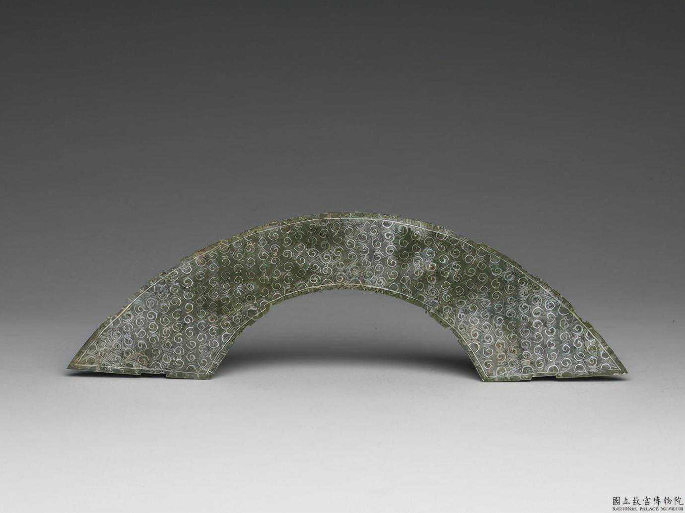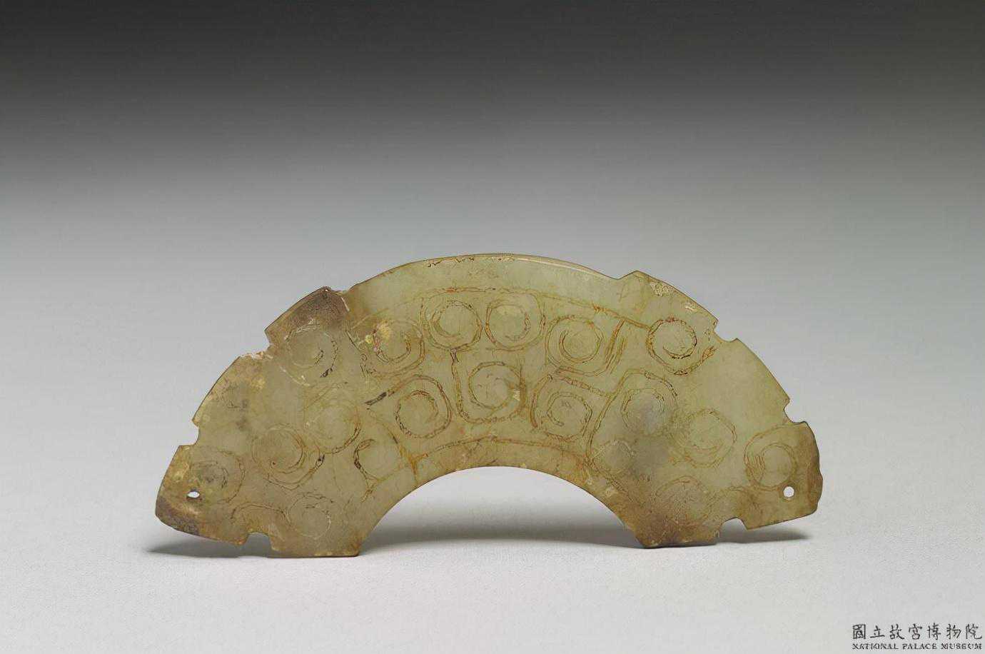 東周玉璜。青白玉,大部分有深褐沁斑。體扁平,作半圓弧形,兩面雕琢以雲紋構成的變體龍紋。璜體上端鑽一圓孔,可供穿繫,玉璜屬於裝飾品類。國立故宮博物院。