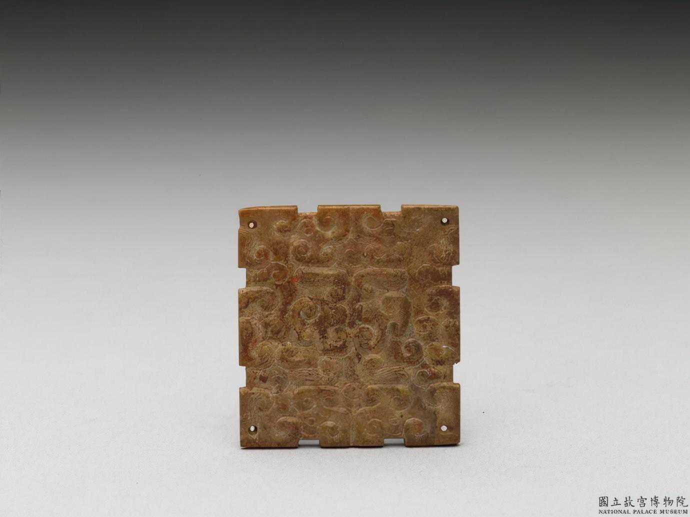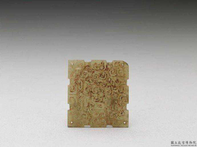 東周玉飾片。青玉,帶濃淡不一的赭斑。長方形玉片,四周有凹凸齒棱,單面淺浮雕雲紋,間有斜線紋,組合而成龍紋。四角各鑽一孔。2.7公分公分公分。國立故宮博物院。