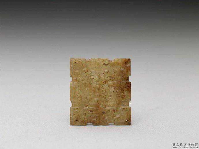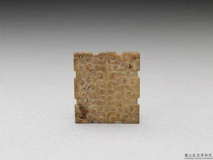 東周玉飾片。青玉,部分為赭色,有白斑。四方形玉片,每邊各有兩個小凹槽,單面遍佈陰線刻雲紋。上下中央各鑽一小孔。3.1公分公分公分。國立故宮博物院。