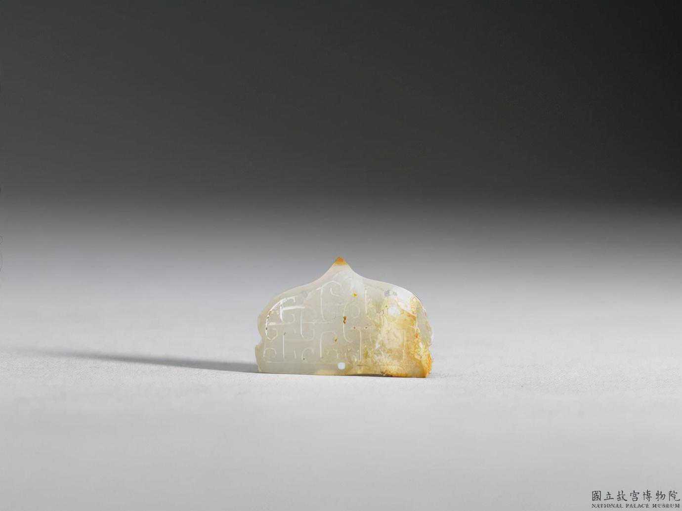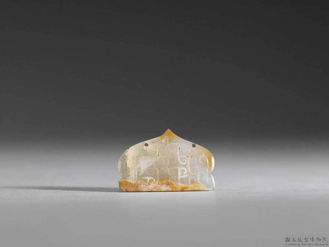 東周玉石飾。半透明白玉,帶黃斑。半圓形玉片,下緣直線,上緣有尖端,左右有小凹。單面沿周圍刻一圈,圈內飾以雲紋。上鑽兩孔,下鑽一孔。2.2公分公分公分。國立故宮博物院。