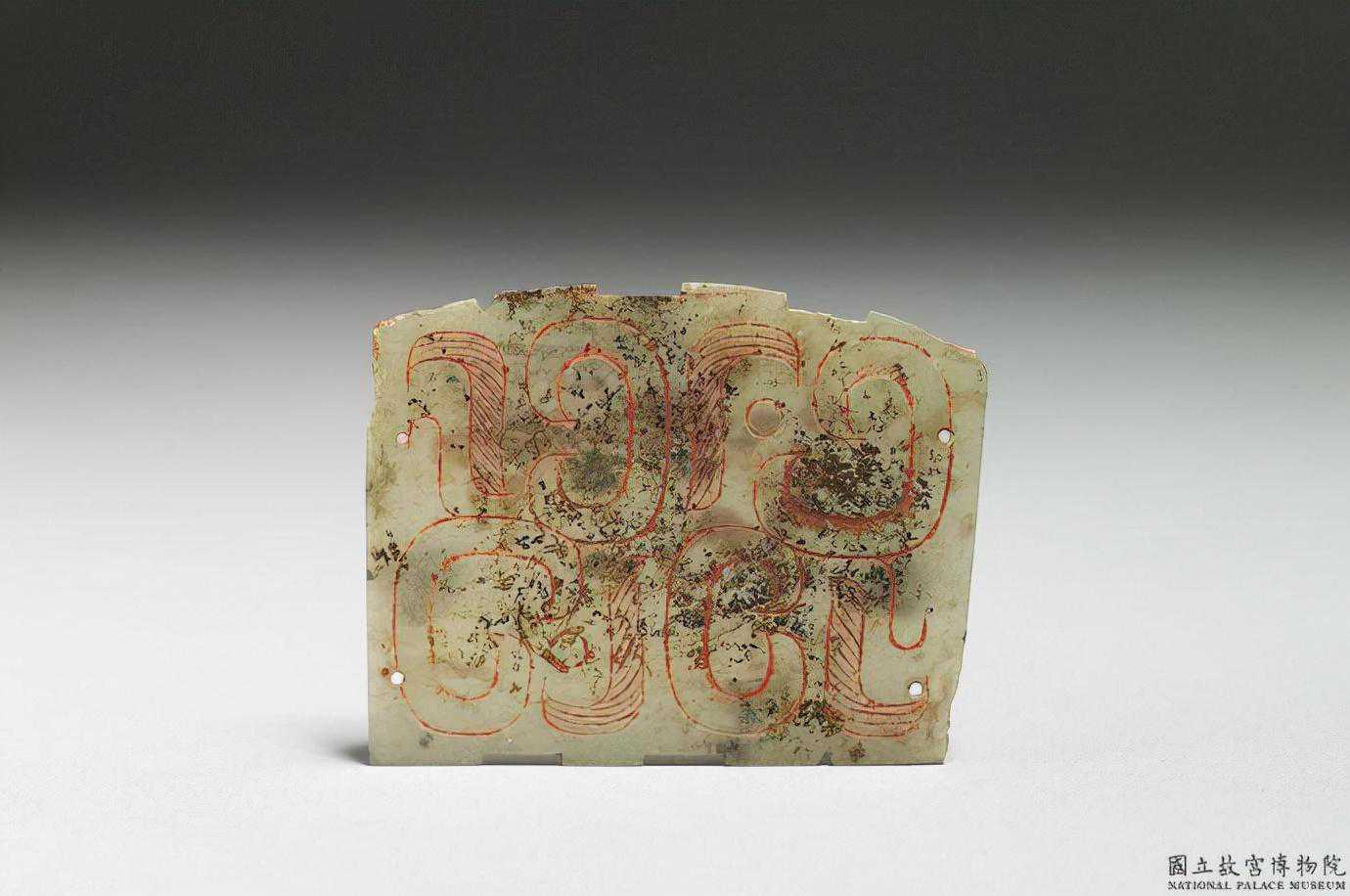東周刻紋玉片。青玉,沾有硃砂。上下緣有小凹,上緣有弧度。單面陰刻竊曲紋,結構幾何化,”L”形部分以平行線填滿,紋飾以上下左右對稱的方式重覆。兩側各鑽兩個小孔。3.5公分公分公分。國立故宮博物院。