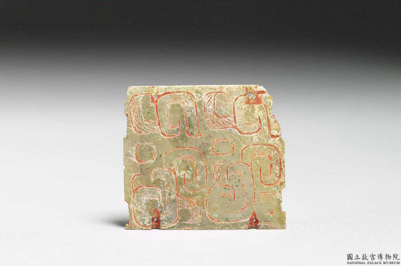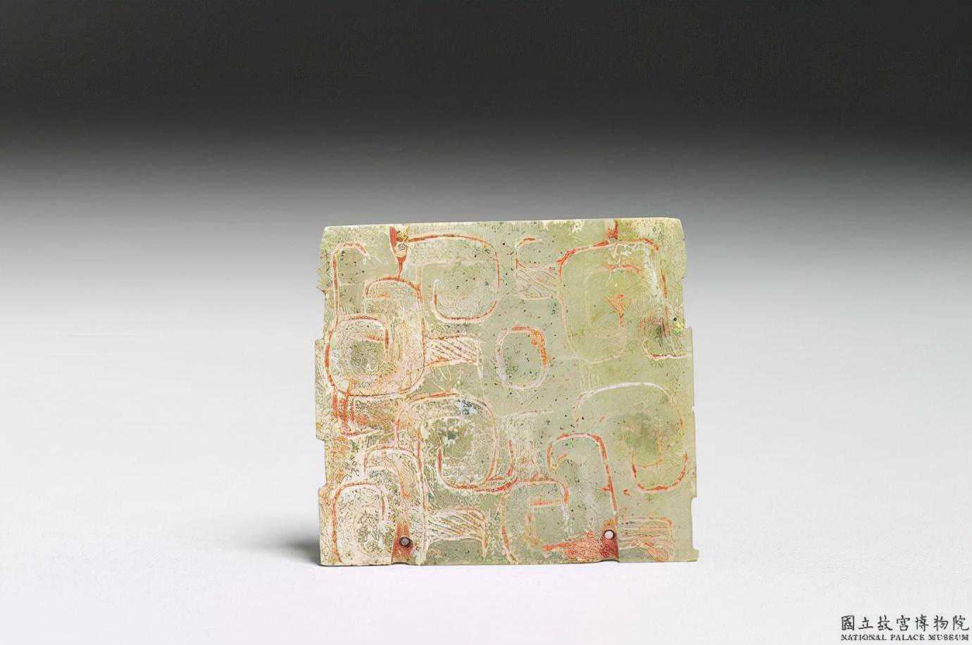 東周刻紋玉片。青玉,沾有硃砂。上下緣各有方形小凹和三角形缺,上緣有弧度,一角有傷缺。單面陰刻竊曲紋,結構幾何化,部分面積以平行線填滿,紋飾上下左右對稱。兩側各鑽兩個小孔,孔外正面有凹槽。3.1公分公分公分。國立故宮博物院。