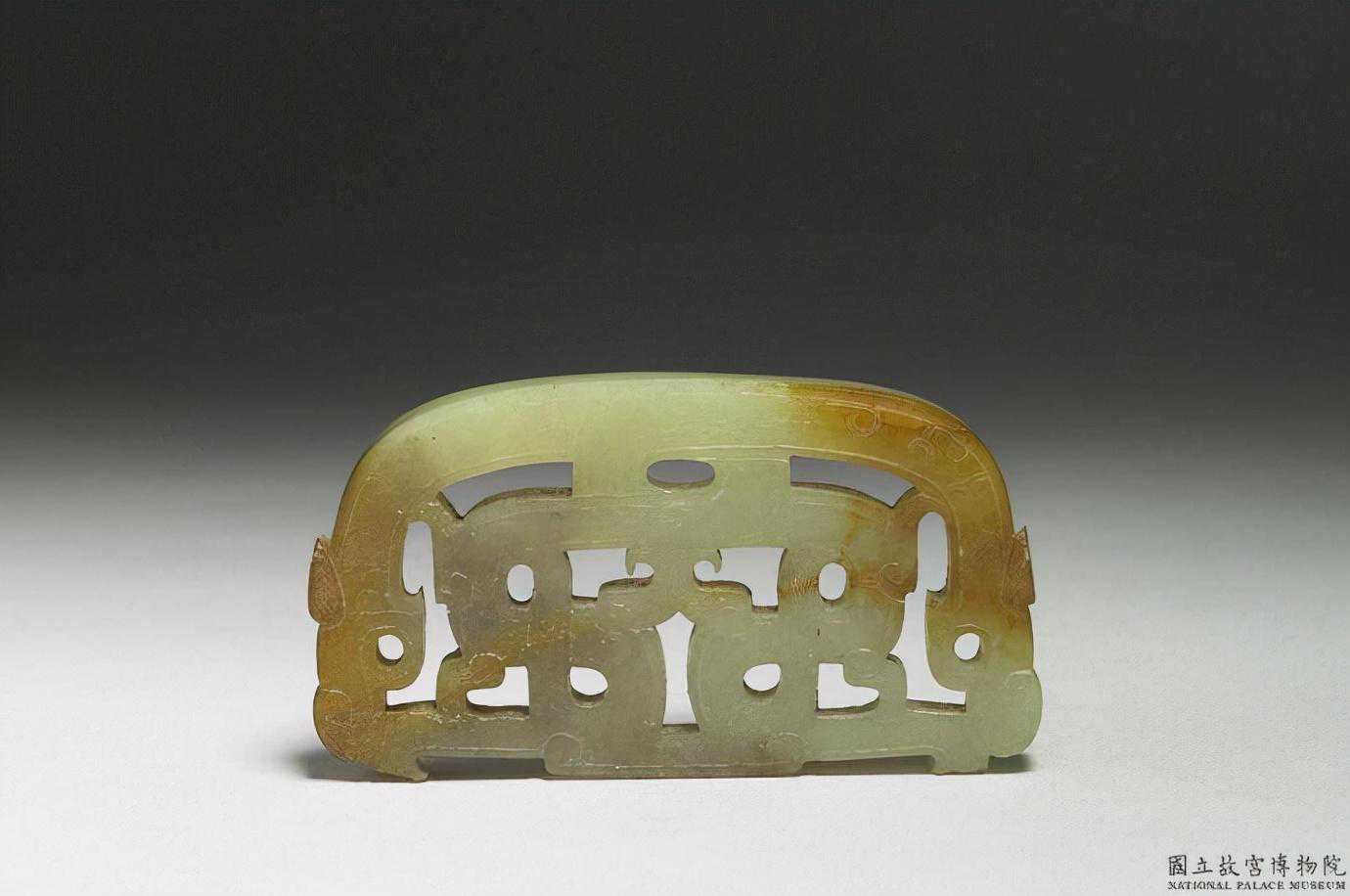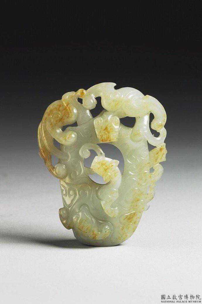 東周龍紋玉飾。青玉,帶赭色斑。近半圓形,鏤空龍紋。6.0公分公分公分。國立故宮博物院。