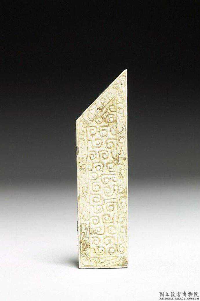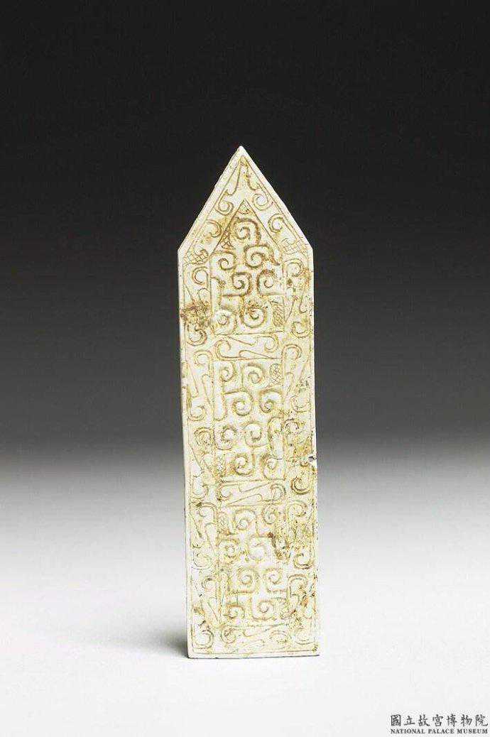 戰國玉圭。表面已深沁為不透明的牙白色,玉質不詳。琢作長方形。背面光素,黏附有咖啡色物質疑為土沁。正面雕有花紋,沿著輪廓有一裝飾帶,飾以細陰線雕成的斜三角紋。裝飾帶包圍的範圍內,以較寬的陰線,琢飾穀紋。尖首圭由戈演變而來,為重要的禮器。高9.6公分。國立故宮博物院。