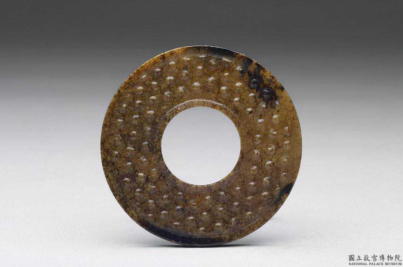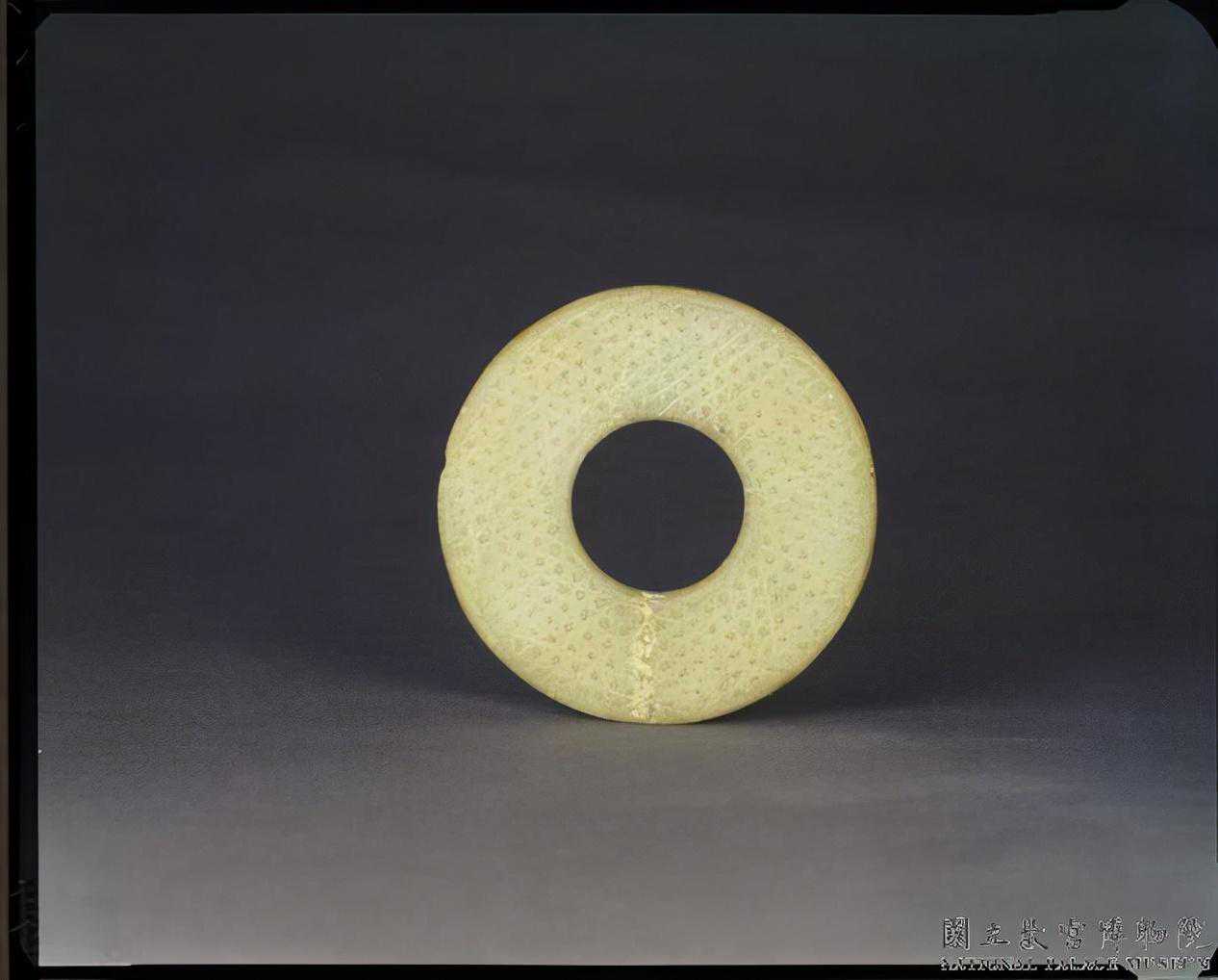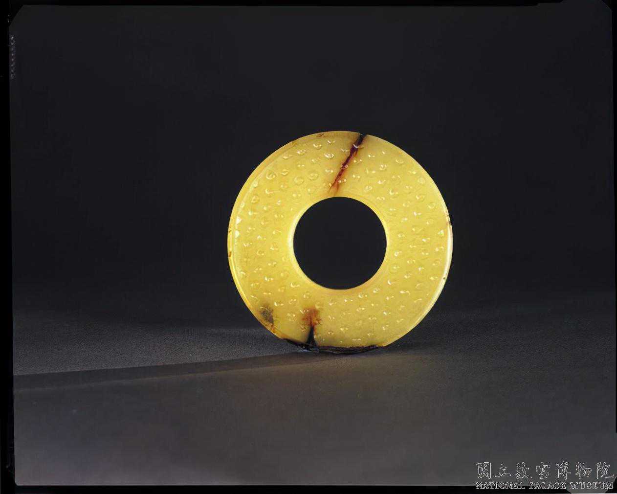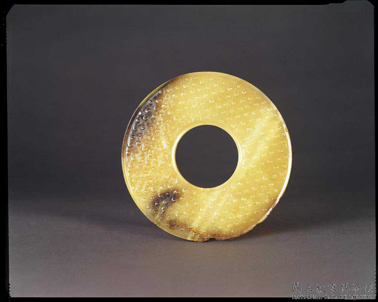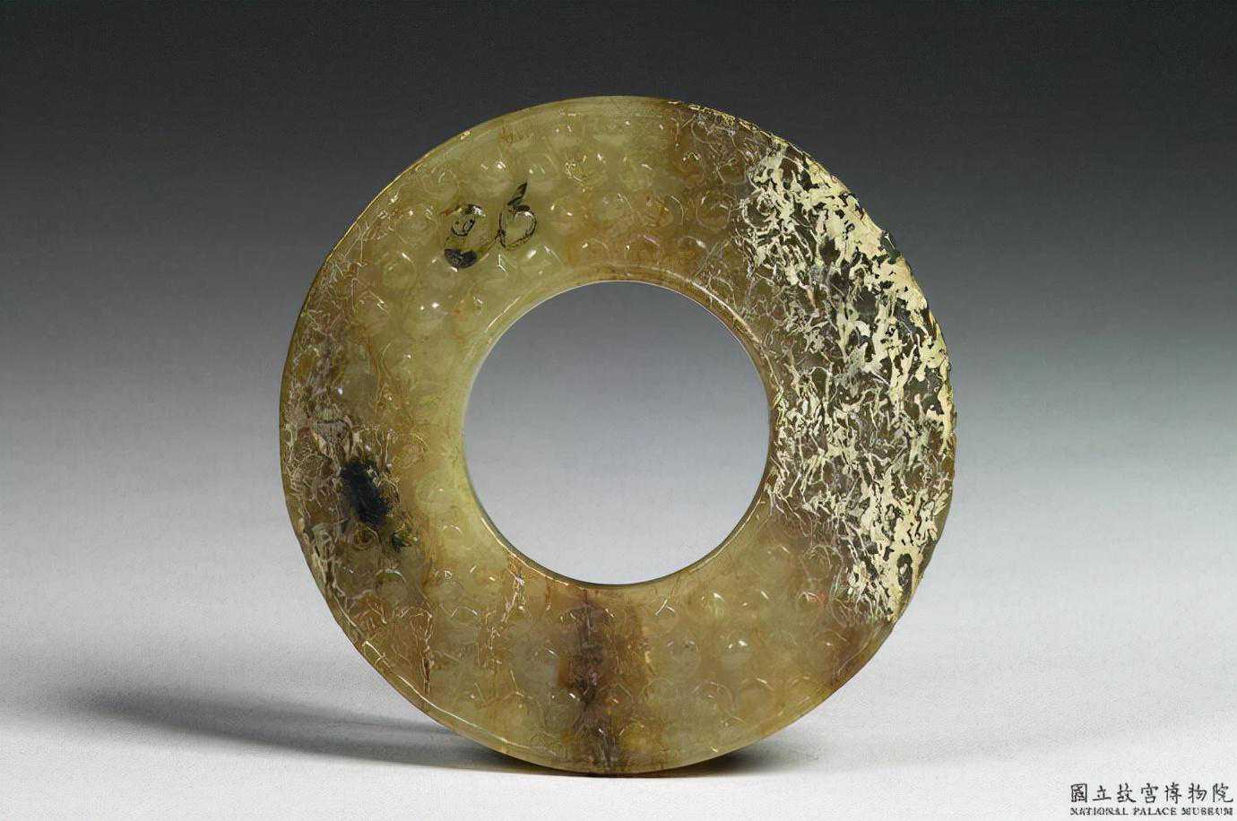戰國穀紋璧。青白玉,泛黃,全器滿布深淺褐斑,璧面一側有土沁痕。全器呈圓璧形,外緣規整。器兩面浮雕穀紋,穀粒飽滿。直徑6.5公分內徑3.1公分厚0.6公分。國立故宮博物院。