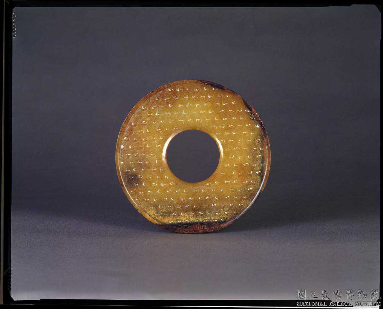戰國晚期至西漢早期穀紋璧。青玉,略黃,邊緣局部有暗褐色沁,一處有小片淡綠色沁,半透明。圓整,有廓,器面上浮雕穀紋,中孔、外緣圓滑平整。直徑19.5公分厚0.5公分。國立故宮博物院。