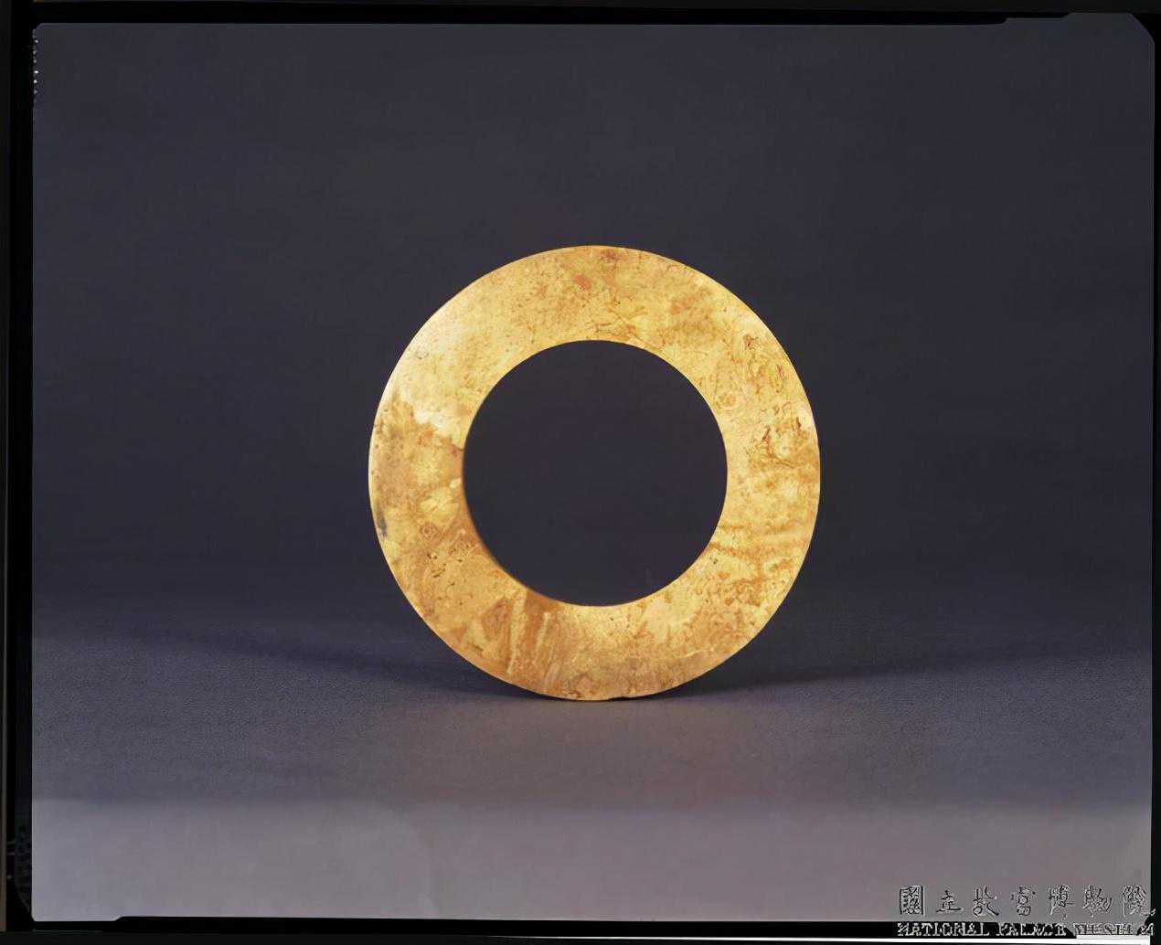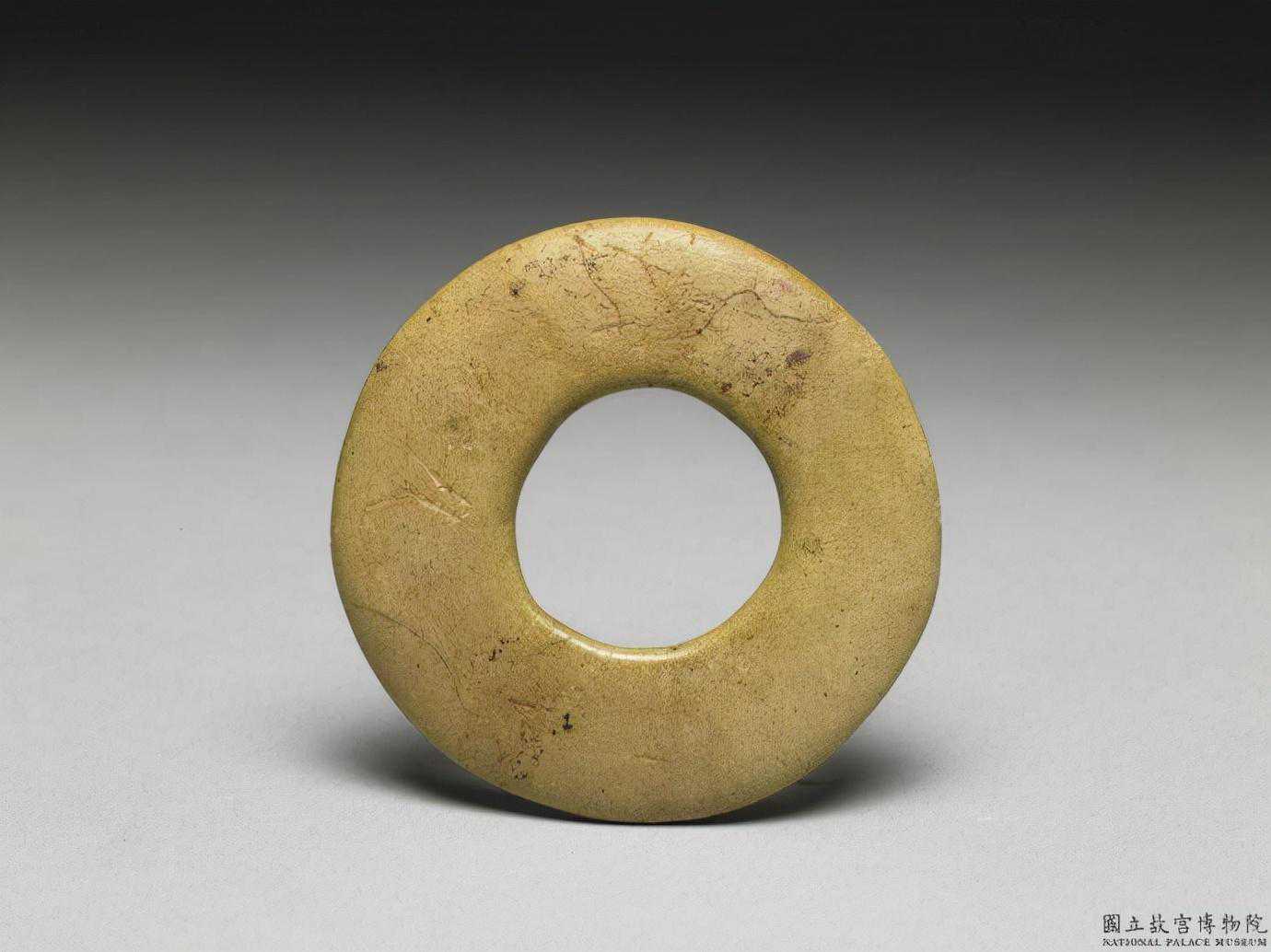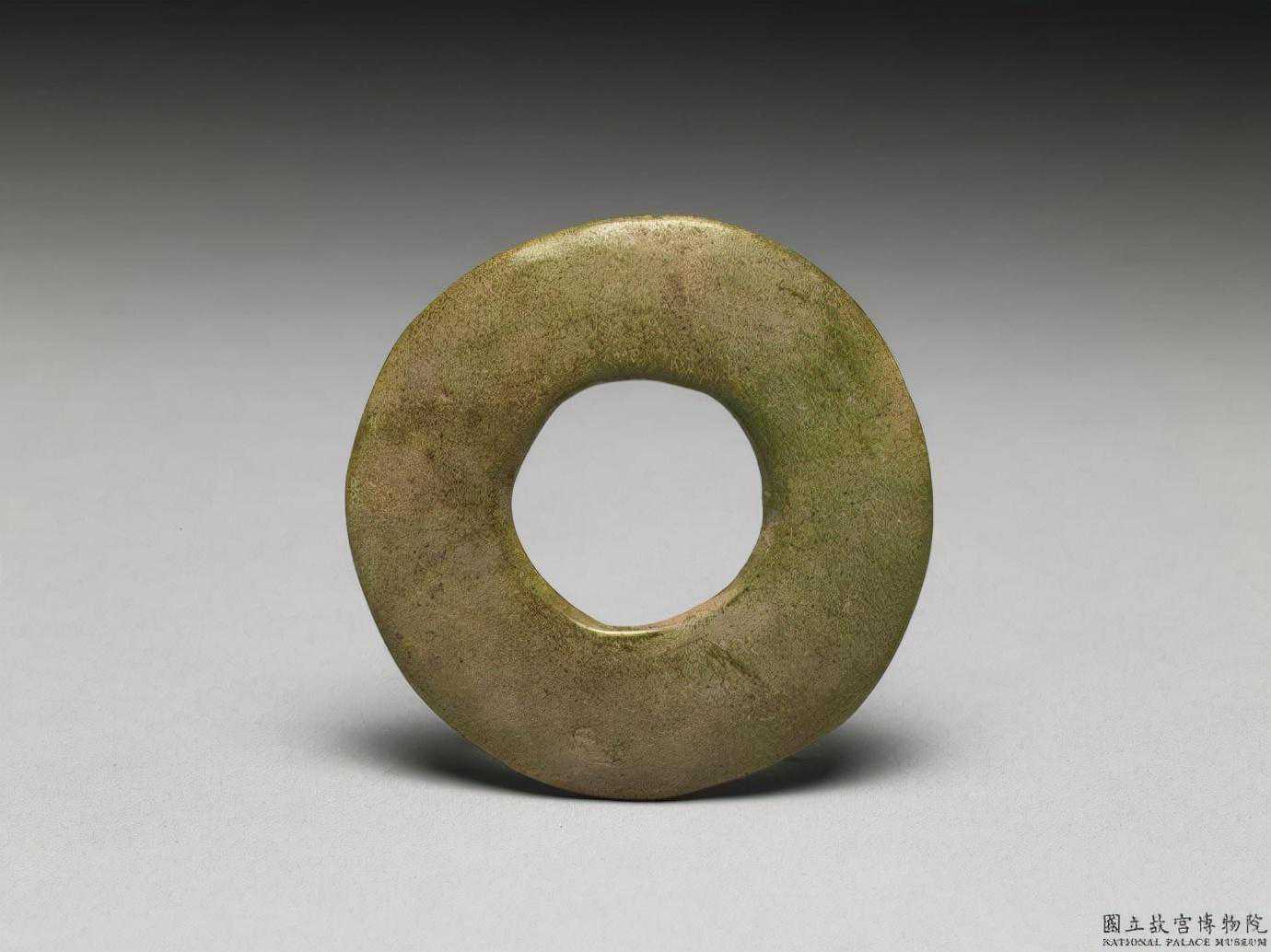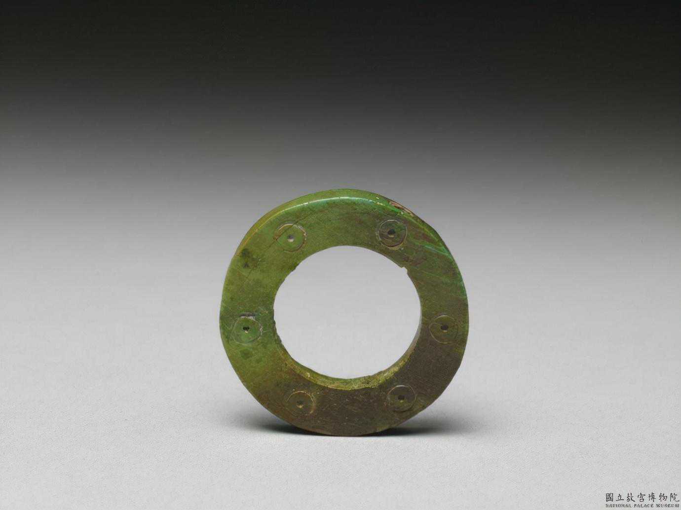 戰國晚期至秦代穀紋環。青玉,局部有淡褐色沁,半透明。不甚圓整,有廓,廓窄且均等;中孔似乎為單面鑽作,鑽作不齊,後加磨飾;器面上刻飾穀紋。直徑10.78公分孔徑6.41公分厚0.51公分。國立故宮博物院。