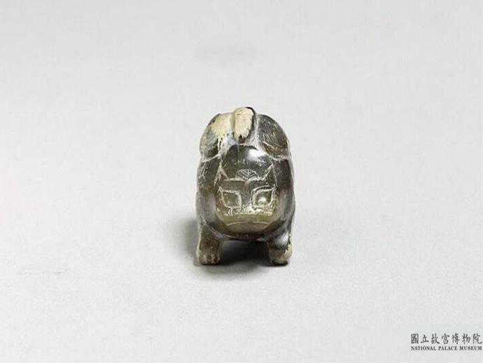 戰國玉蹲獸。褐色玉,尚溫潤,局部白沁。雕一小蹲獸,作抬頭狀,有二角與長尾。自前胸至尾端有一直穿,供繫帶。寬1.6公分長1.9公分高1.3公分。國立故宮博物院。