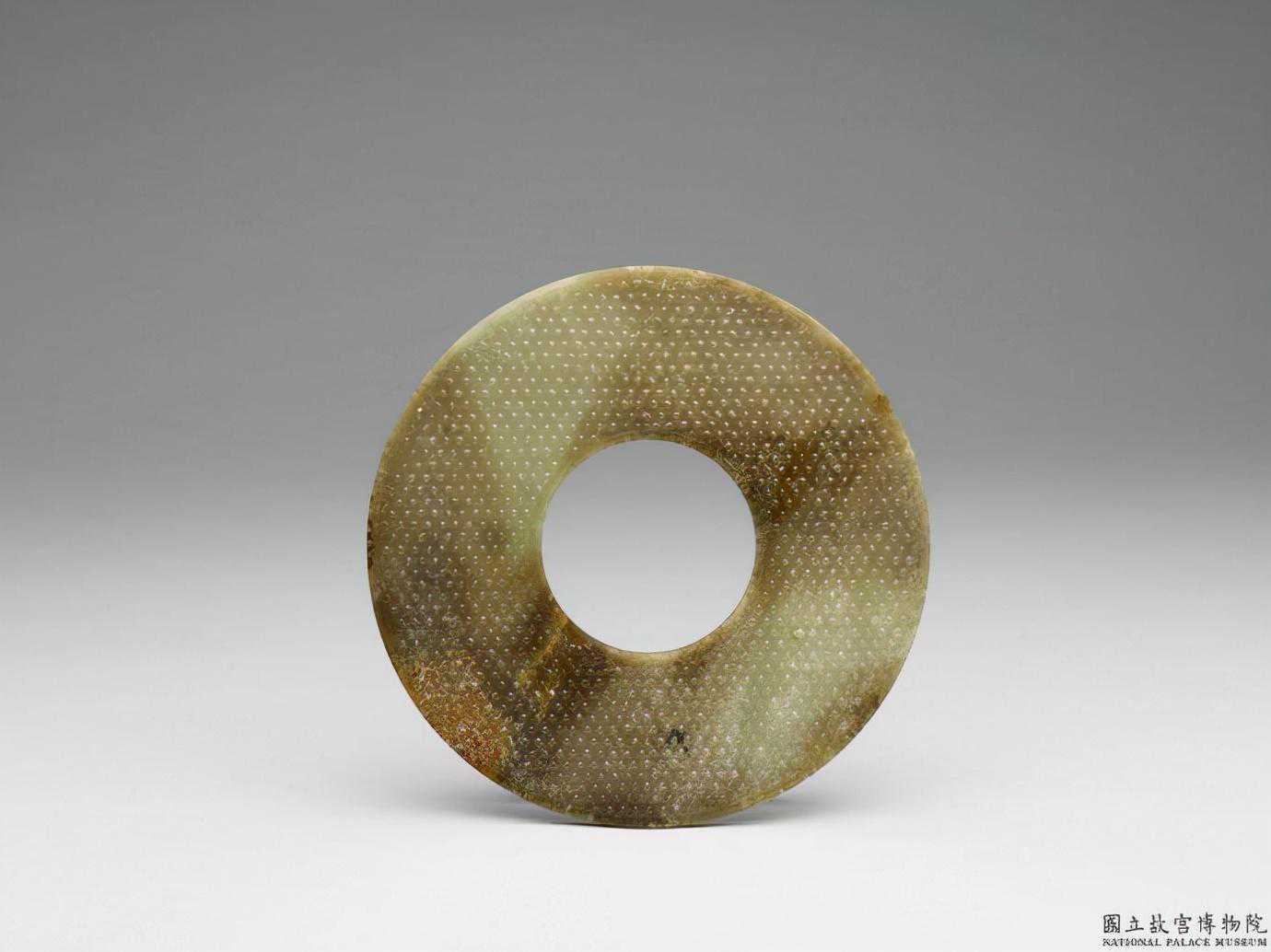 戰國晚期至秦代穀紋璧。青玉,局部有淡褐色沁,半透明。不甚圓整,有廓,廓窄且均等;中孔似乎為單面鑽作,鑽作不齊,後加磨飾;器面上刻飾穀紋。直徑10.8公分內徑6.3公分。國立故宮博物院。
