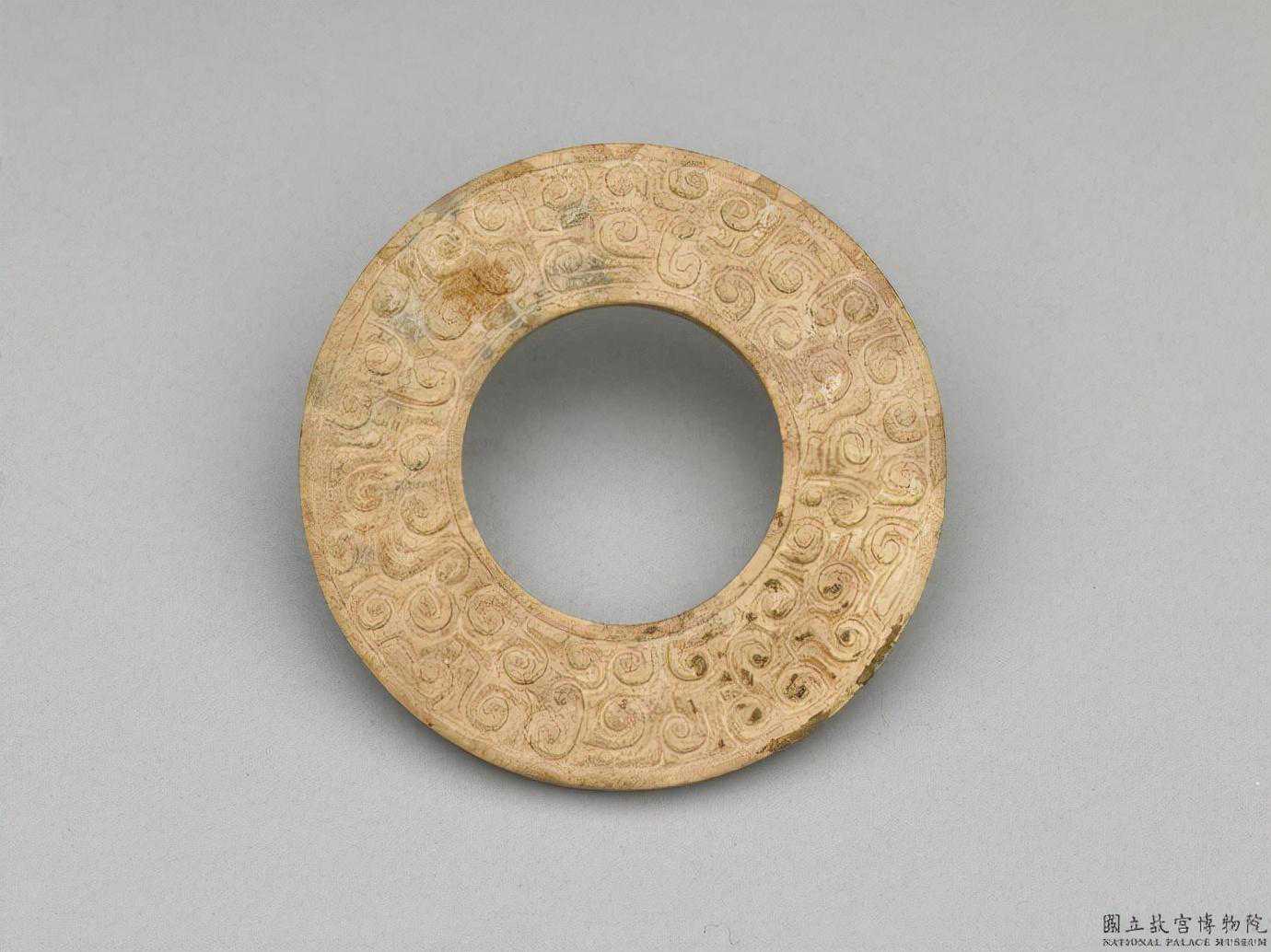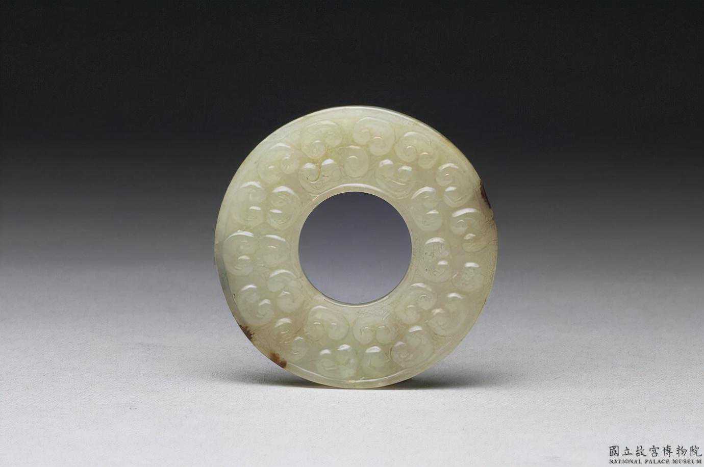 戰國西漢玉雲紋璧。器形規整,厚薄一致。璧的一面飾排列整齊的鉤連雲紋;另一面則飾分佈均勻的如意雲紋,兩面紋飾不同,這種情形並不常見。徑5.0.公分厚0.5公分。國立故宮博物院。