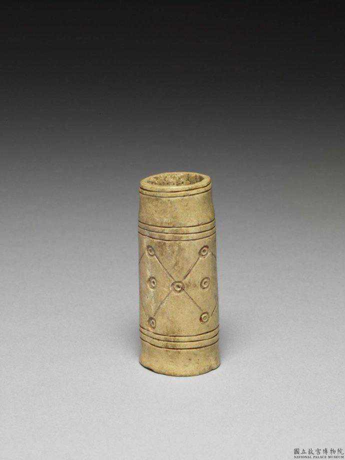 戰國至漢雕骨管。取一段骨磨成管狀,器表近小口徑之一端深刻二道弦紋,中段陰刻三道圈點紋,上下兩道刻五個圈點紋,中央一道多一個,又以斜陰線連接四圈點紋,組成三個菱形紋。高5.9公分。國立故宮博物院。