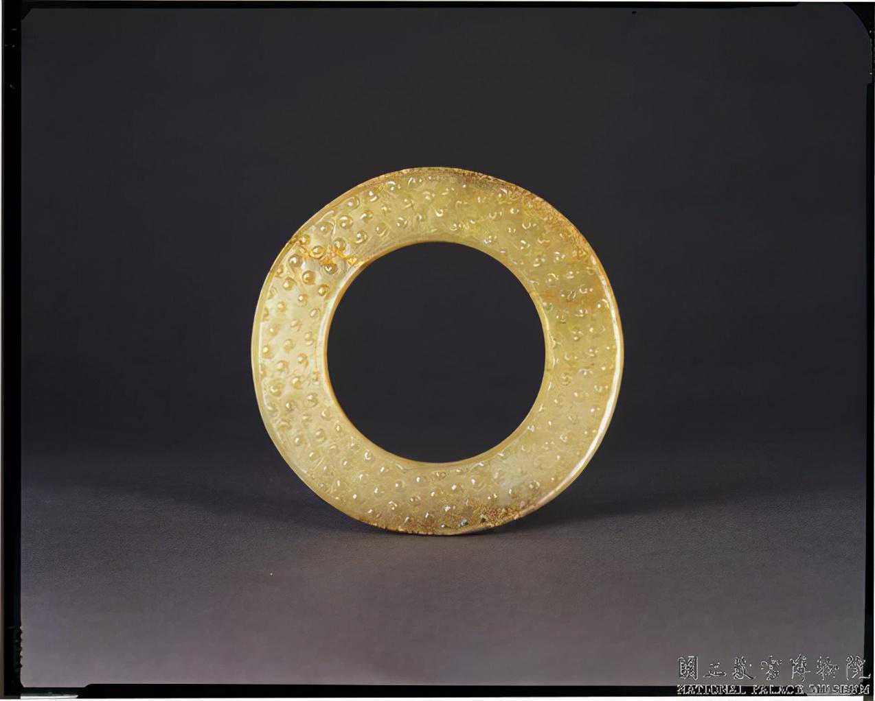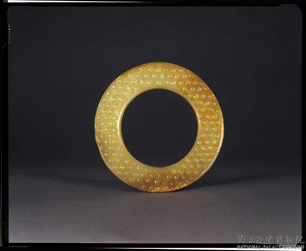 戰國玉穀紋環。玉質。有赭斑,口徑略大,器之兩面皆琢穀紋為飾,內外廓均凸起。厚0.5公分徑8.2公分孔徑3.3公分。國立故宮博物院。