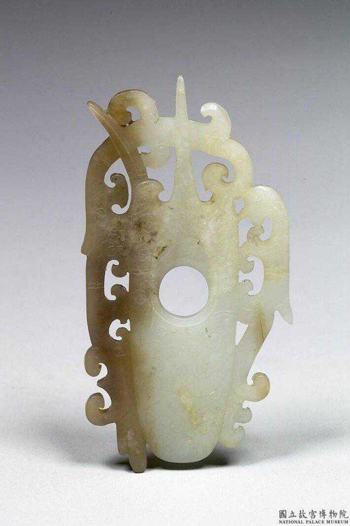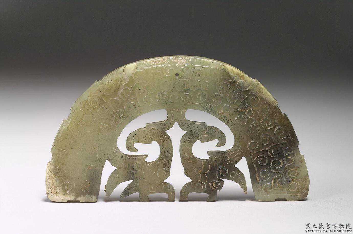 戰國雙鳳紋珩。青黃玉,局部灰黑色雜質,邊緣處略有白沁。半圓形,上方琢成一璜,滿飾雲紋,下方鏤雕一對玉鳳。璜上有一直條切割痕,直痕以上斜削下,其背面微有老傷痕,故疑其為新石器時代末期玉器在戰國時改琢而成。寬8公分高4.5公分。國立故宮博物院。