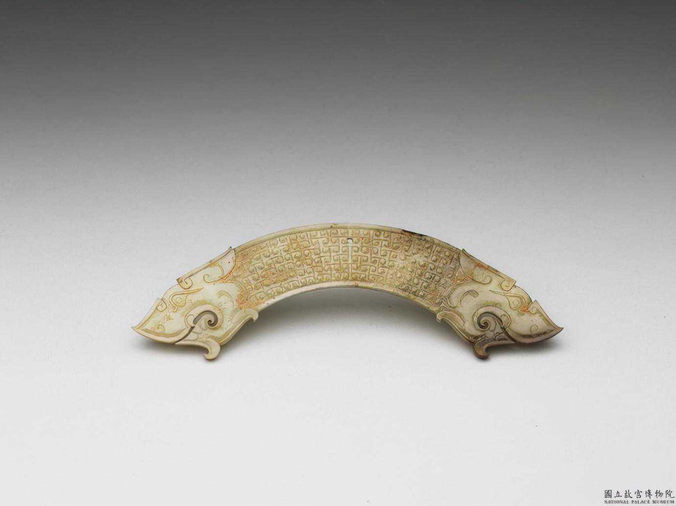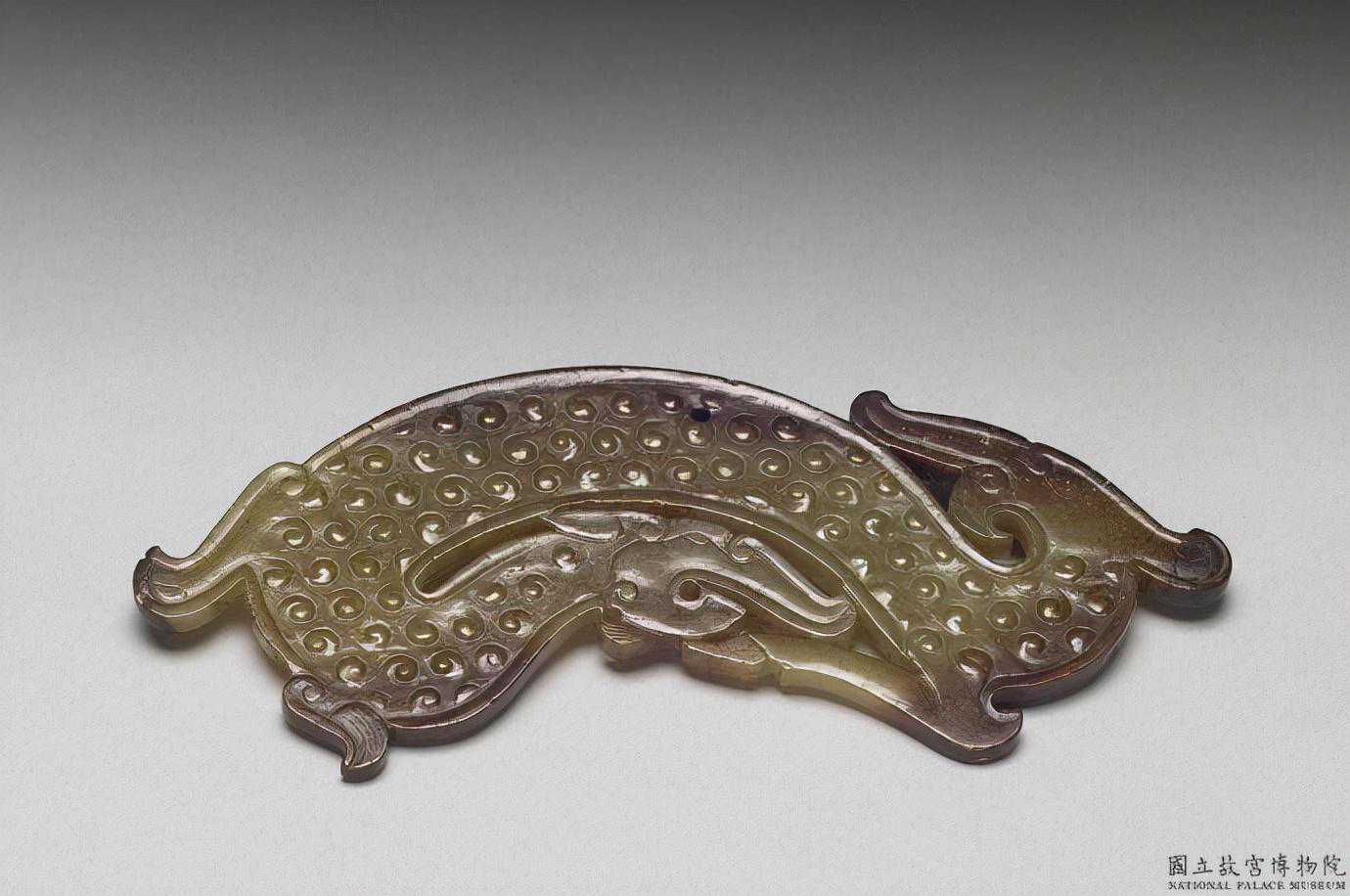 戰國龍紋璜。瑩透溫潤的青白玉,局部為帶褐斑。雕一片狀彎弧形璜,兩端雕龍頭,中段琢連續T字母形雲紋。為典型的戰國晚期風格。長18.6公分厚0.5公分。國立故宮博物院。