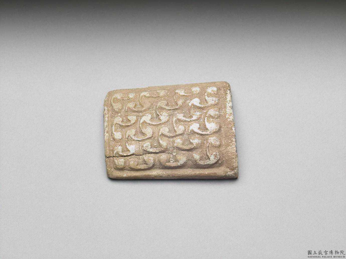 戰國至漢雕骨雲紋飾件。器做窄梯形,取骨片磋磨而成,器表浮雕雲紋。這類雲紋與戰國或漢代玉器上連續雲紋約略相似,但因質材特性,紋飾雕磨較粗略。長4.8公分寬3.8公分。國立故宮博物院。