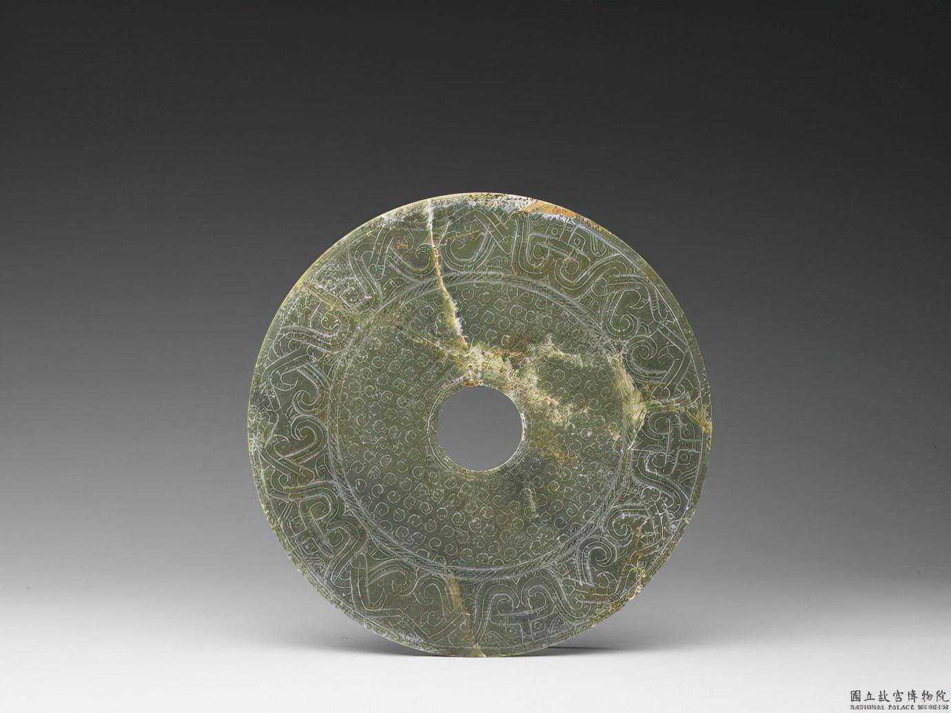 戰國至西漢早期龍鳳紋璧。青綠色玉。花紋作內外兩圈。內圈琢穀紋,外圈琢雙身動物面紋。25.5公分公分公分。國立故宮博物院。