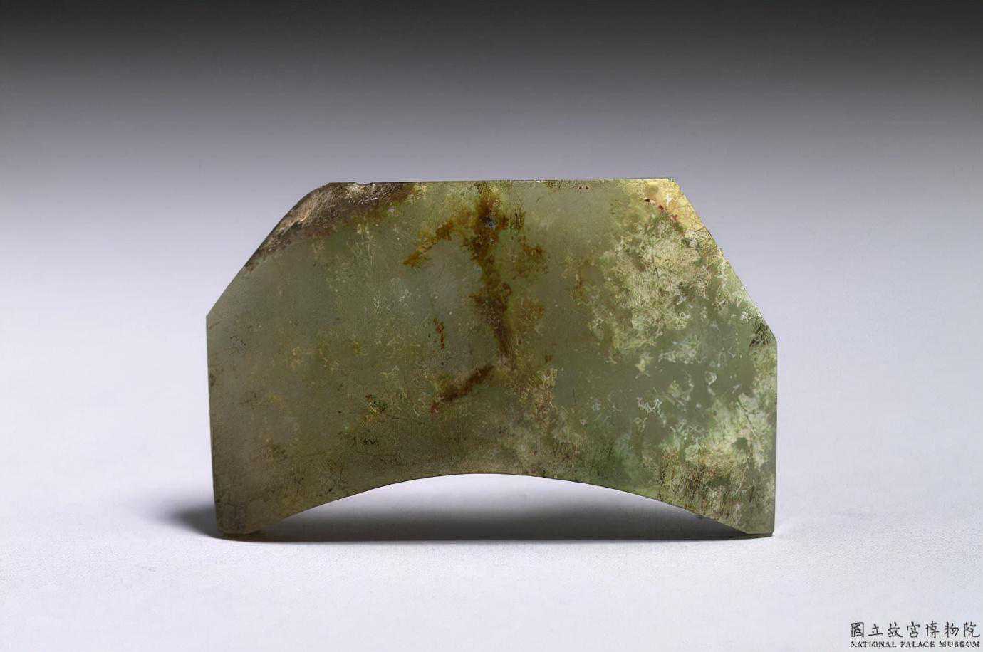 東周玉飾片。綠色玉,有白斑、赭斑、芝麻黑斑,表面帶有一些附著物。似玉璜的形狀,惟上方作梯形而非圓弧形,正反面皆為平面。全器無穿孔。3.5公分×2.1公分×0.5公分。國立故宮博物院。