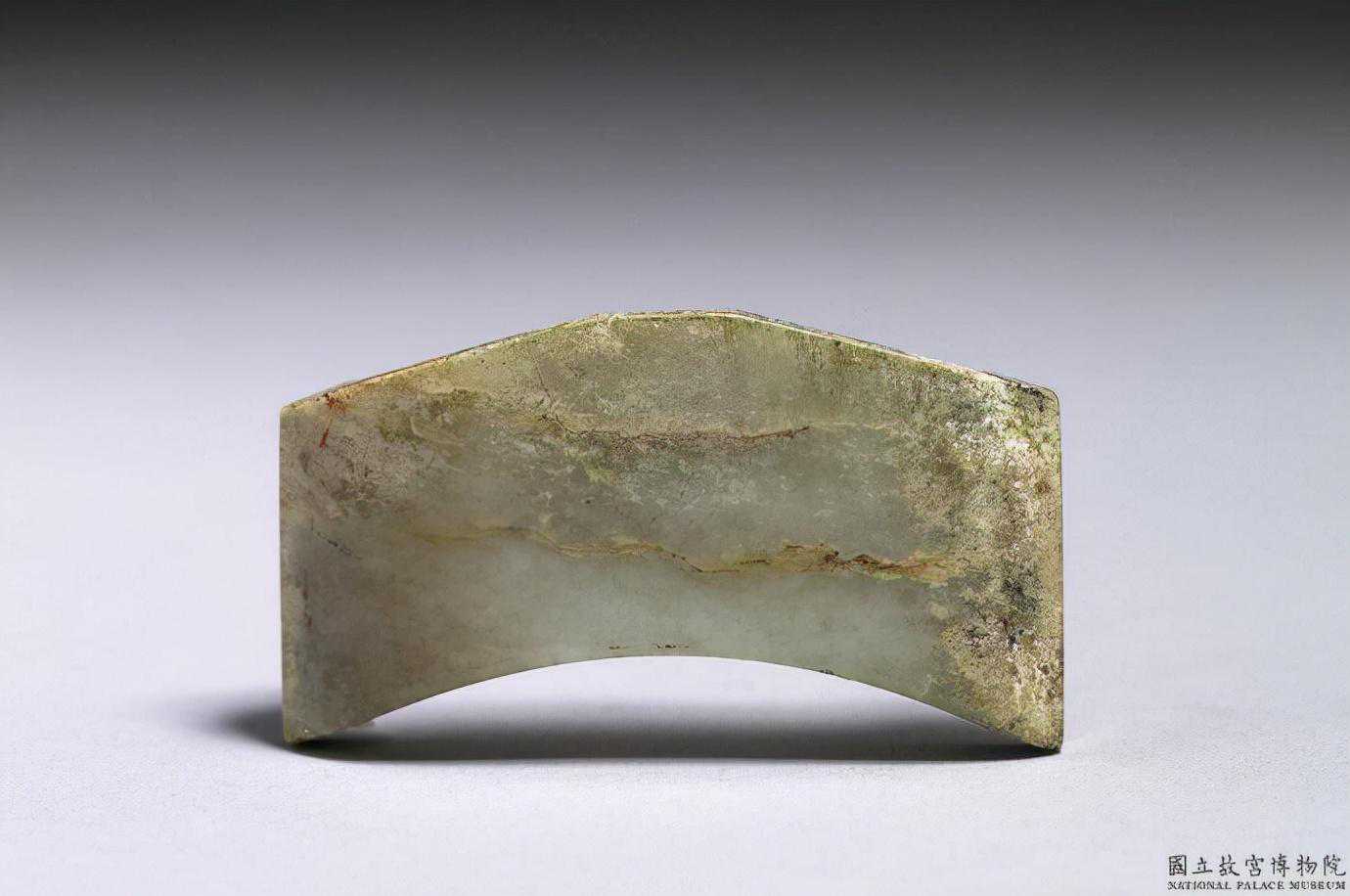 東周玉飾片。青玉,有明顯裂璺,局部為褐色。玉璜形玉片,兩邊厚中間薄,正面兩側向後斜,反面猶見琢製的痕跡。全器無穿孔。3.4公分×1.9公分×0.4公分。國立故宮博物院。