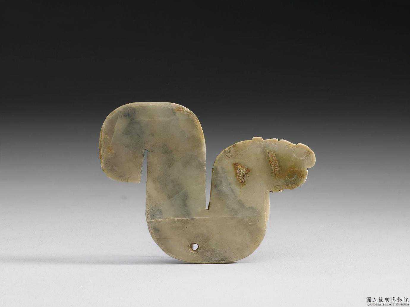 東周未完工玉龍珮。青灰玉,有裂痕及硃砂,泛白斑、墨斑。器作龍形,龍身軀似蛇,龍首的輪廓模糊。龍的腹部鑽一小孔,以穿繩佩戴。8.0公分公分公分。國立故宮博物院。