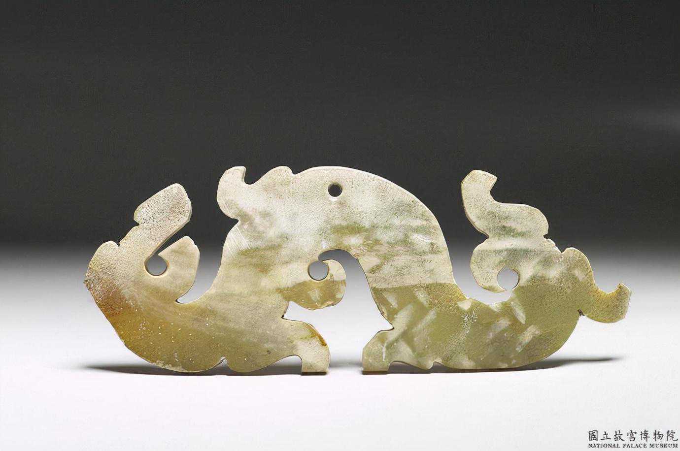 戰國青黃玉龍形珮(一對)。青黃玉,局部褐色沁與灰白色沁雕一對龍形珮,其中一件龍角處已殘斷。器表留有切璞時的直條切痕,尚未雕其他花紋。應屬為完工之作品,由其特徵觀之,應為先雕成形,而後再加以平剖為二而成。長13.35、12.1公分厚約0.4-0.5公分。國立故宮博物院。