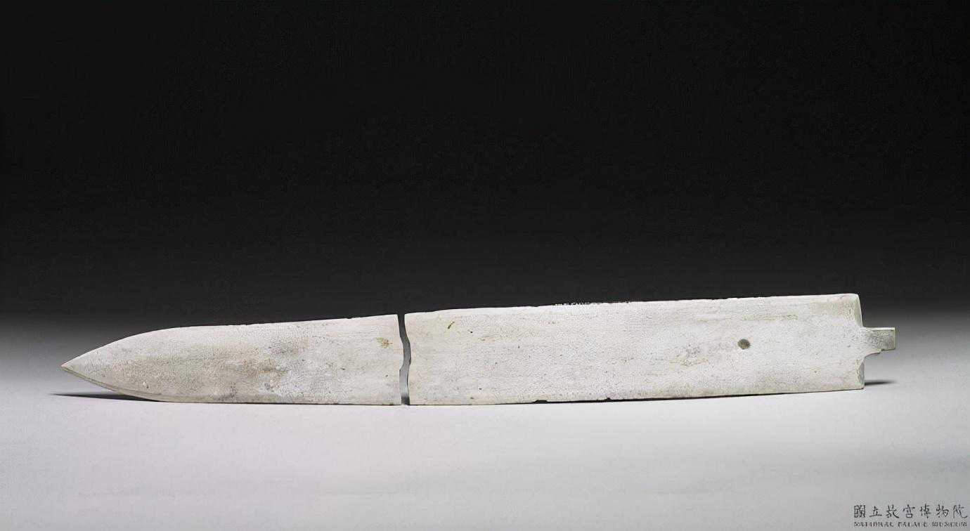 戰國石劍(以及附件)。石質,白灰色澤,夾有灰點。全器作前端尖峰的長方體,援周邊雕為雙面薄刃,器身下方有一孔。劍身於三分之一處斷裂。另外附有劍飾四:璏、鐔、劍柄與劍首36.5公分劍首直徑3.97公分;內柄長10.3公分;劍鐔寬5.15公分;劍璏長7.2公分。國立故宮博物院。
