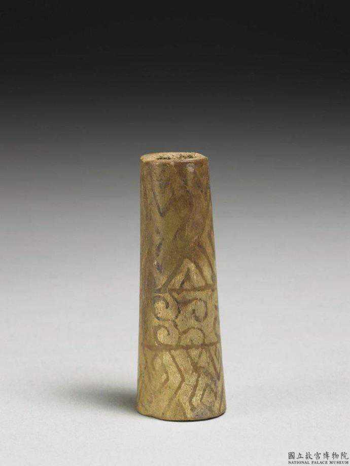 戰國至漢彩繪骨管。在一段骨管上以褐彩繪雙鉤山字紋與線狀榖紋,紋飾分三層,上下層為山字紋,中央為線狀榖紋。高5.8公分。國立故宮博物院。