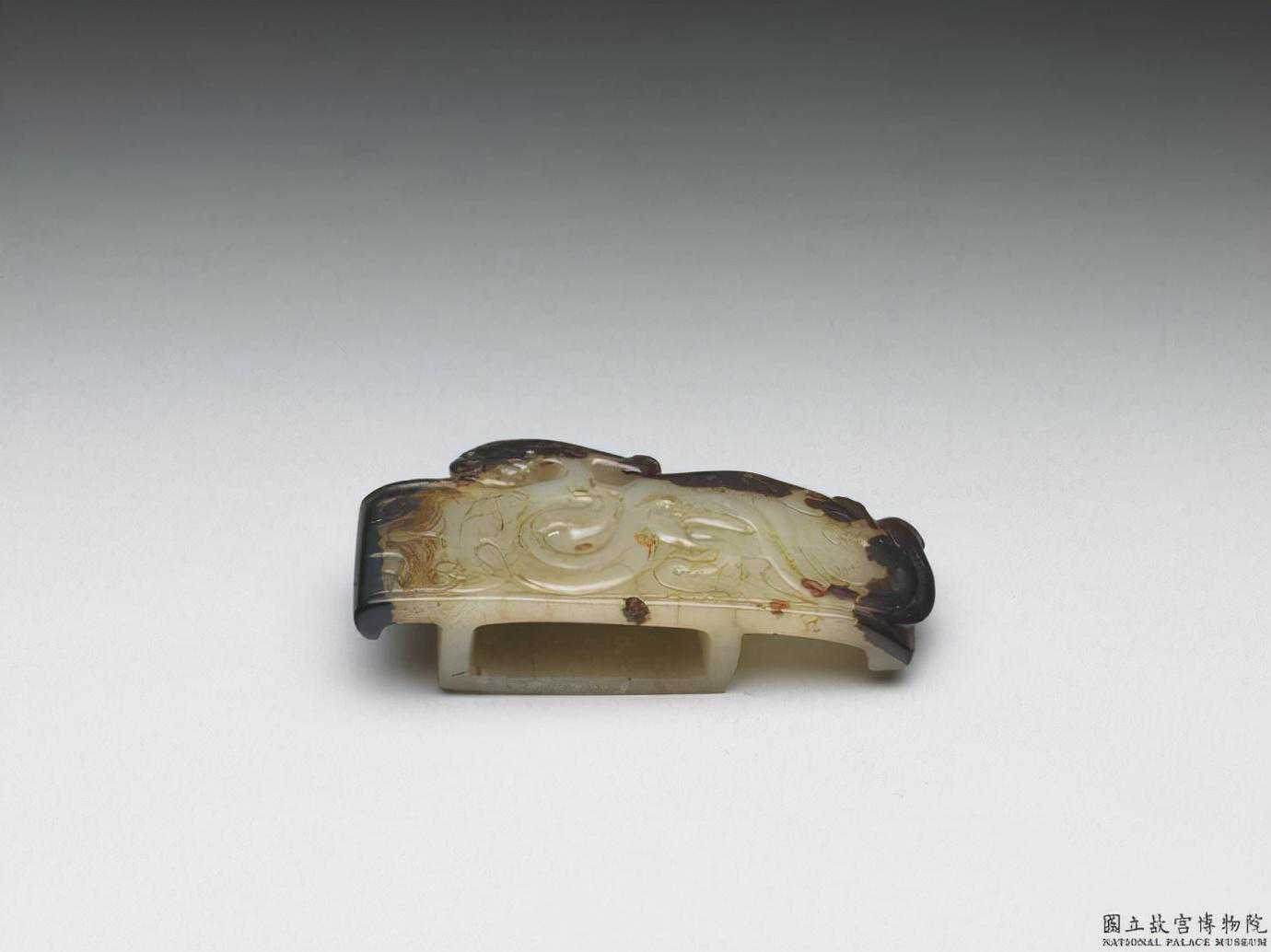 戰國舊玉璏。白玉,雜赭斑,有舊傷缺,底部有裂紋。器面琢蟠螭紋,螭首廓出,一端作獸首。劍國立故宮博物院。是嵌飾於劍鞘上的飾物,同時,具有用以固定革帶的功能。全高2.3公分長6.3公分寬3.1公分。國立故宮博物院。