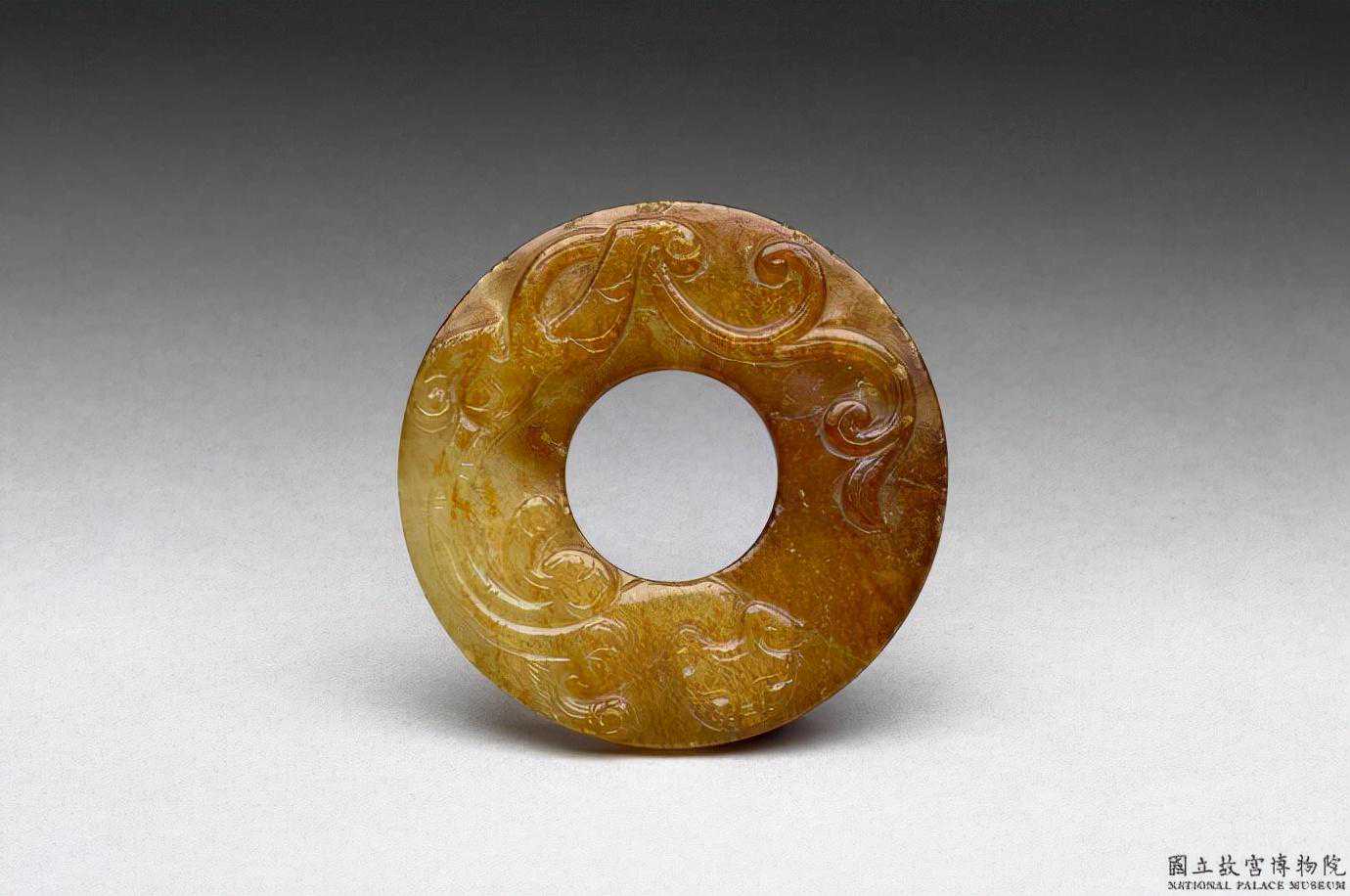 戰國早中期雲穀紋璧。玉質,全器呈均勻的褐白色,局部尚留有黃褐色玉質。圓整,兩面飾以勾雲紋。兩件系璧成對,形制、大小、花紋均同。此種勾雲紋一般認為是春秋早期以來的蟠螭紋之解體形,是由較寫實的花紋結組,走向抽象的幾何形結組的過程。直徑4.83公分孔徑2.86公分厚0.34公分。國立故宮博物院。
