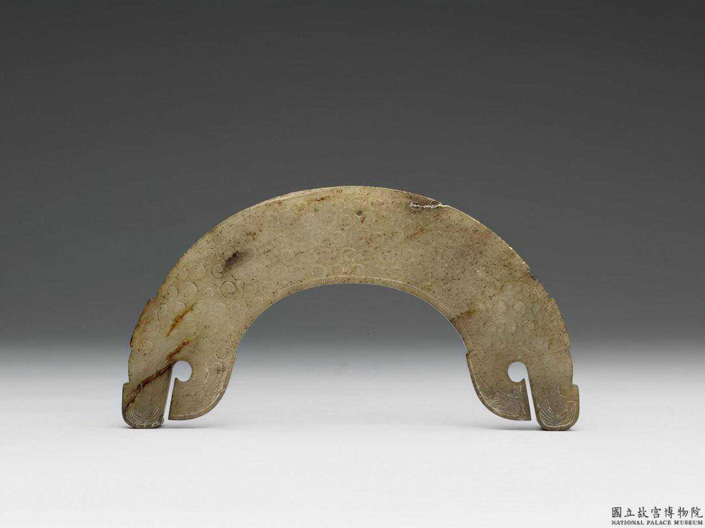 東周晚期龍紋璜。白玉,兩端雜赭斑。璜形,器內較平直,兩端作龍首,面琢穀紋。長13公分肉最寬2.2公分厚0.5公分。國立故宮博物院。