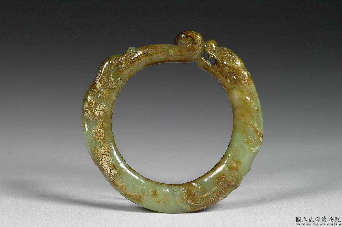戰國舊玉瓏。全器作龍形,首尾相連,卷鼻張口,呈環形。器身附一尾蟠螭。直徑9.2公分內徑6.3公分。國立故宮博物院。