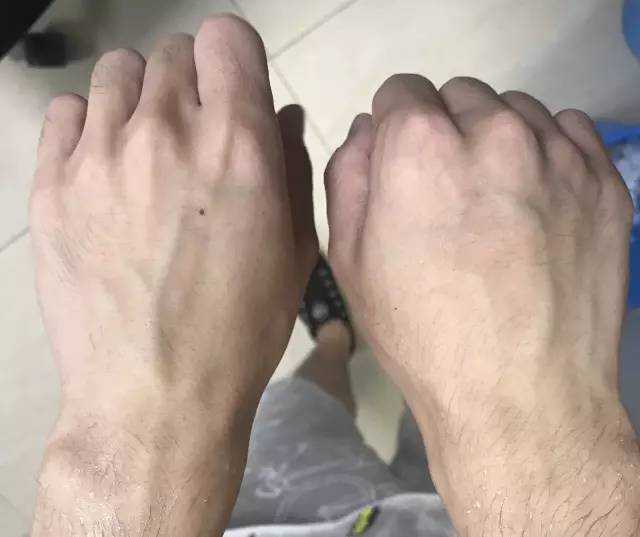 部门小哥哥的两条手臂,左手臂试验1、4号产品,右手臂试验2、5号产品,手背使用3号产品。
