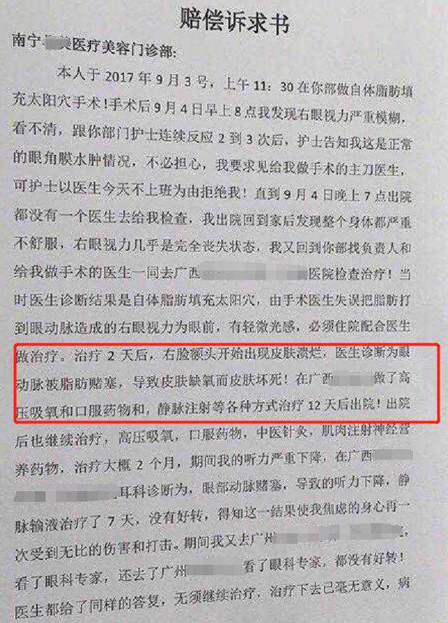 韦女士告诉记者,医生当时讲情况比较严重的,“因为我左眼视力是正常的,右眼视力只看得到眼前的一点点手指,当时就配合医生的各种治疗,通过做检查,医生判断为:眼动脉栓塞。医生说是因为打自体脂肪填充太阳穴的时候,手术失误打到眼动脉里面去堵塞了才导致眼睛视力下降。”